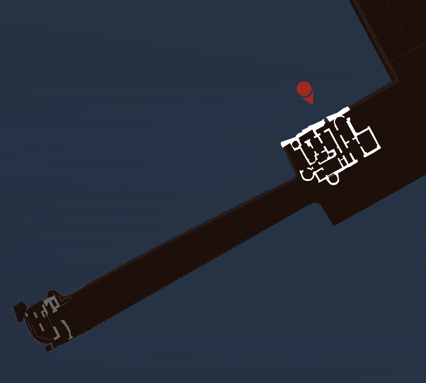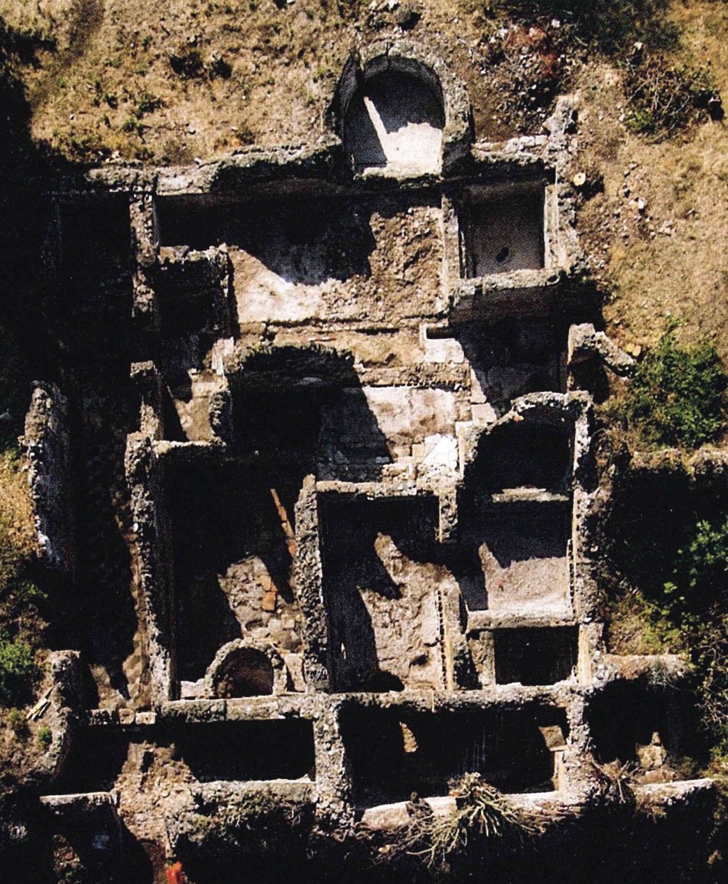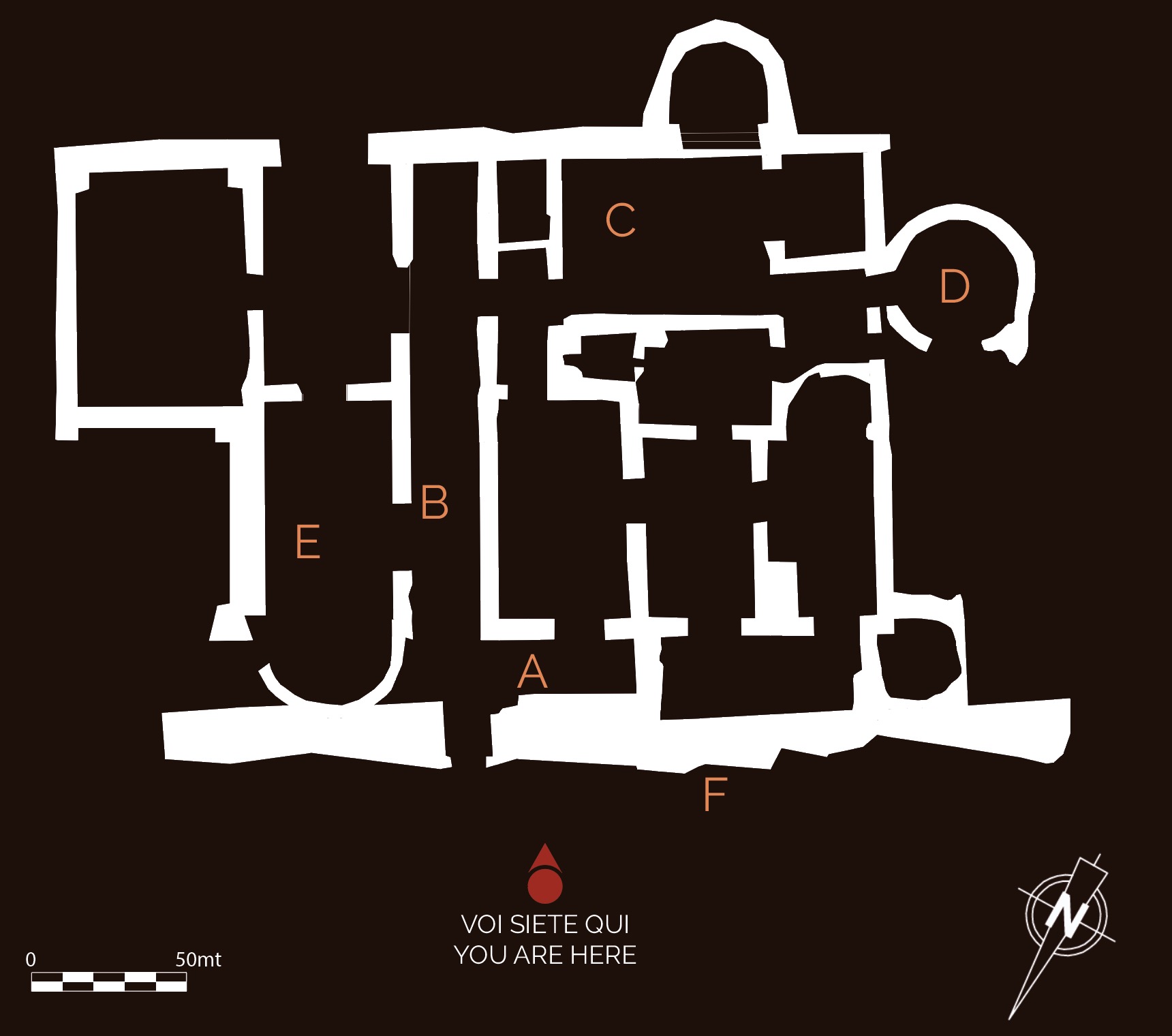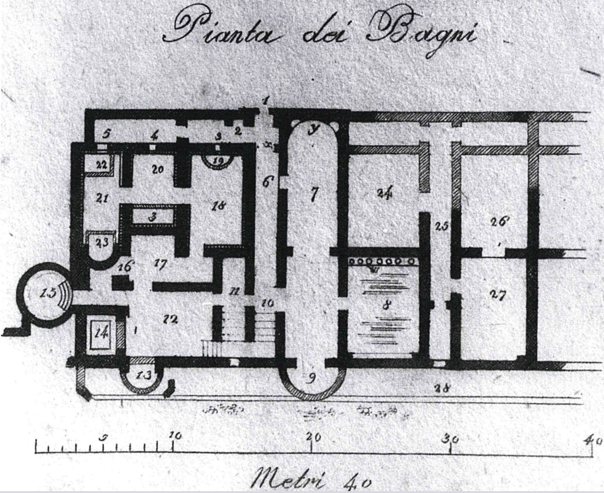 La costruzione di questo complesso termale si data tra la fine del III e l’inizio del IV secolo d.C. Dall’ingresso si accede al corridoio di servizio dei forni (A) e a quello (B) che conduce agli ambienti termali, organizzati attorno a un vano di disimpegno (C): a nord si dispongono le stanze riscaldate e a sud quelle fredde, tutte provviste di vasche. Dallo stesso disimpegno si accede a un’ulteriore vasca riscaldata a pianta circolare (D), mentre nel settore orientale dell’edificio si trova un ambiente absidato e pavimentato a mosaico figurato (E). Le terme rimasero in uso anche dopo la costruzione delle mura della città (F), erette verso la fine del V secolo d.C. e addossate alla fronte nord del complesso.