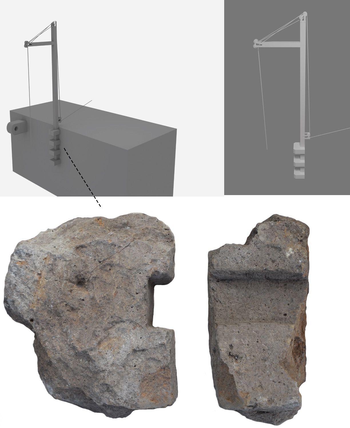 Ricostruzione di una gru verticale e foto del blocco di ancoraggio della stessa al molo