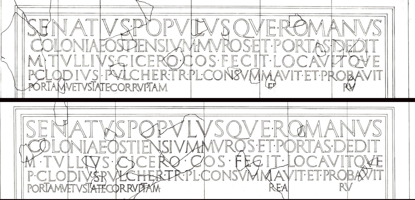 "Il Senato e il popolo Romano deliberarono la costruzione delle mura della colonia ostiense. M. Tullio Cicerone la avviò e la appaltò