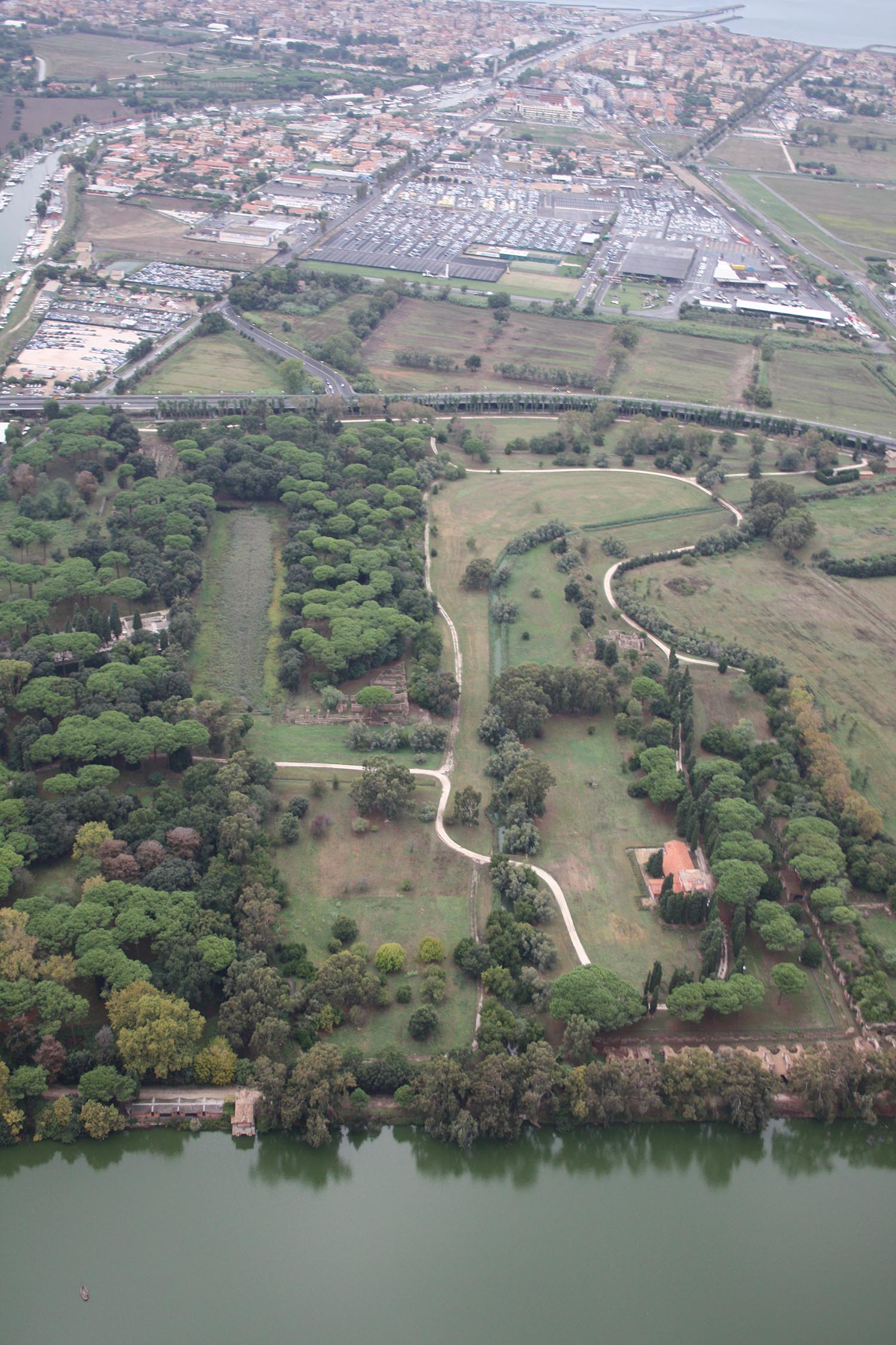 Veduta aerea dell’area un tempo occupata dal canale di imbocco del porto di Traiano, vista da est