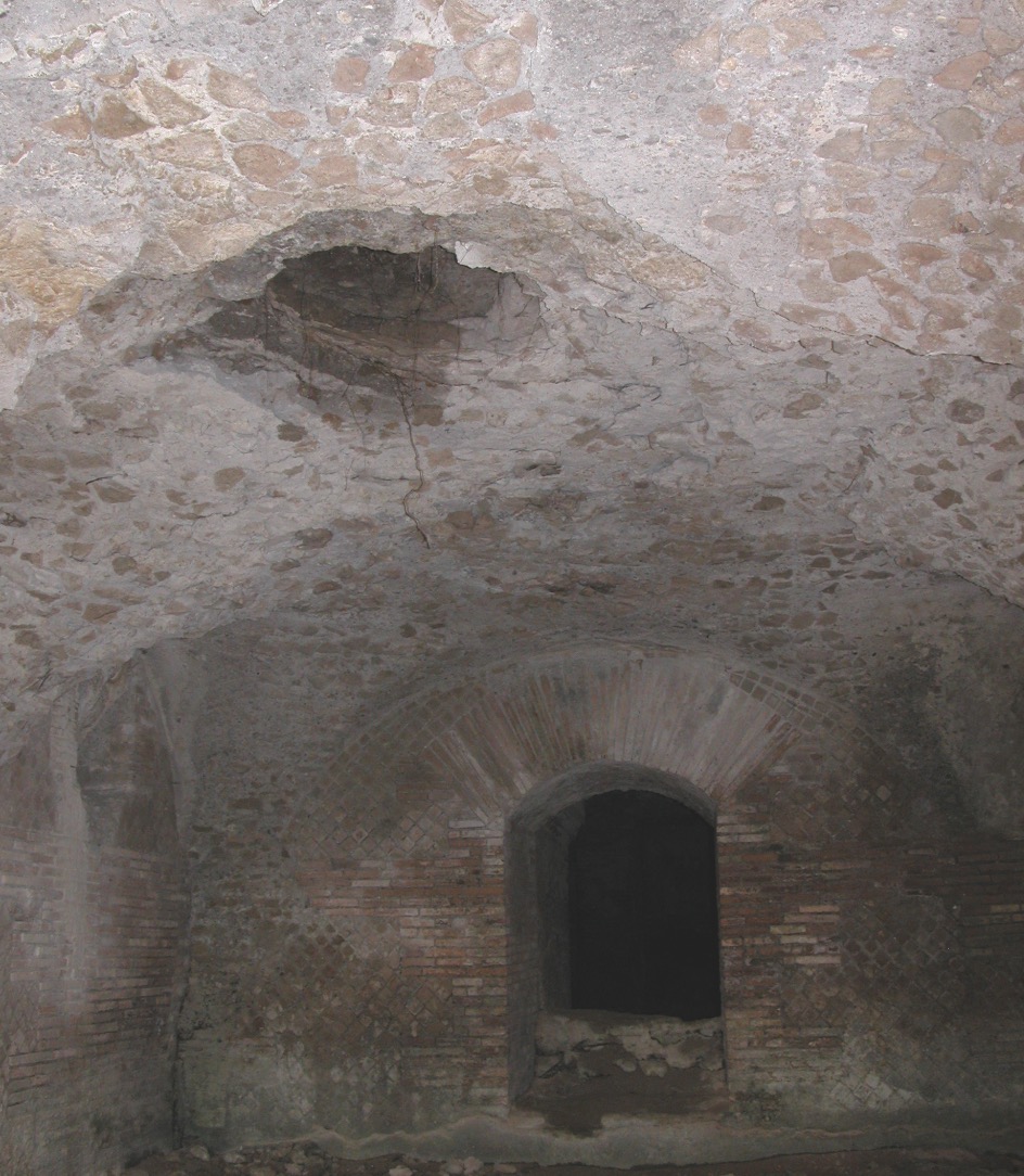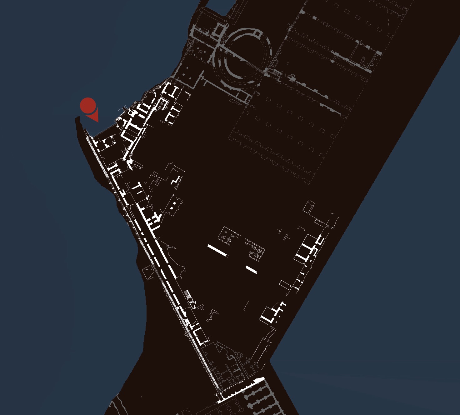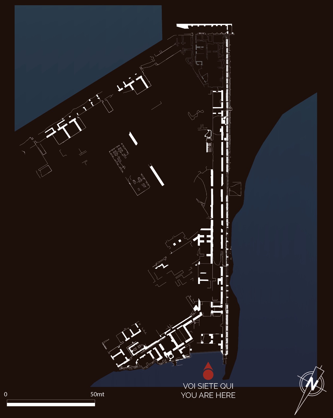 Da questa posizione è possibile vedere il corridoio di servizio posto alle spalle della facciata del Palazzo Imperiale. A est di questo corridoio, al livello del pianterreno, si sviluppa un’intricata serie di ambienti di servizio che presumibilmente replicava l’articolazione del primo piano; in uno di questi ambienti sopravvive la base di un forno da pane di forma circolare, probabilmente di età moderna. Al pianterreno dell’edificio è inoltre presente una grande cisterna voltata, provvista internamente di due pilastri. All’estremità orientale del complesso gli ambienti contornano un peristilio, da cui prendono luce tramite finestre a bocca di lupo aperte al primo piano.