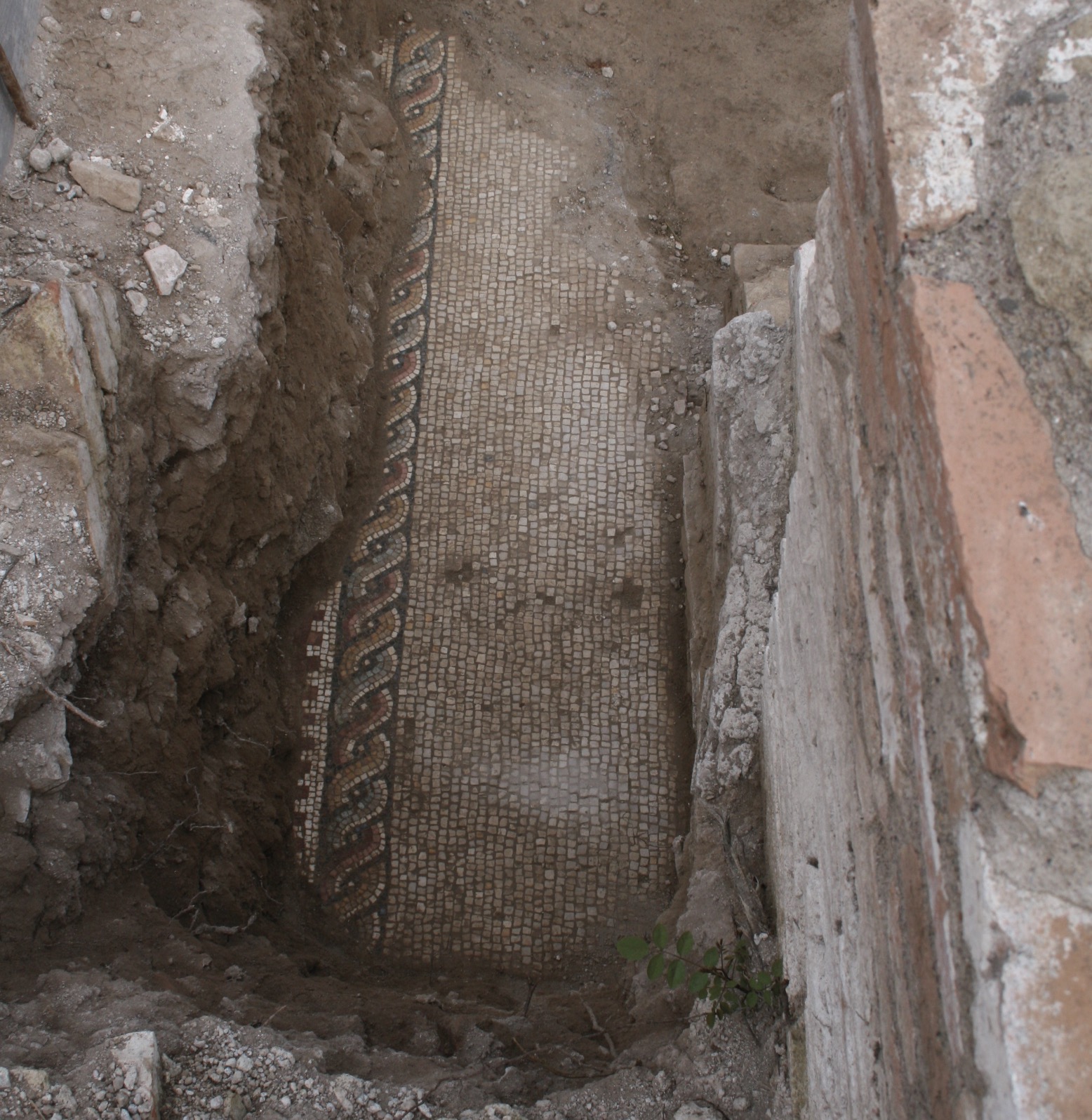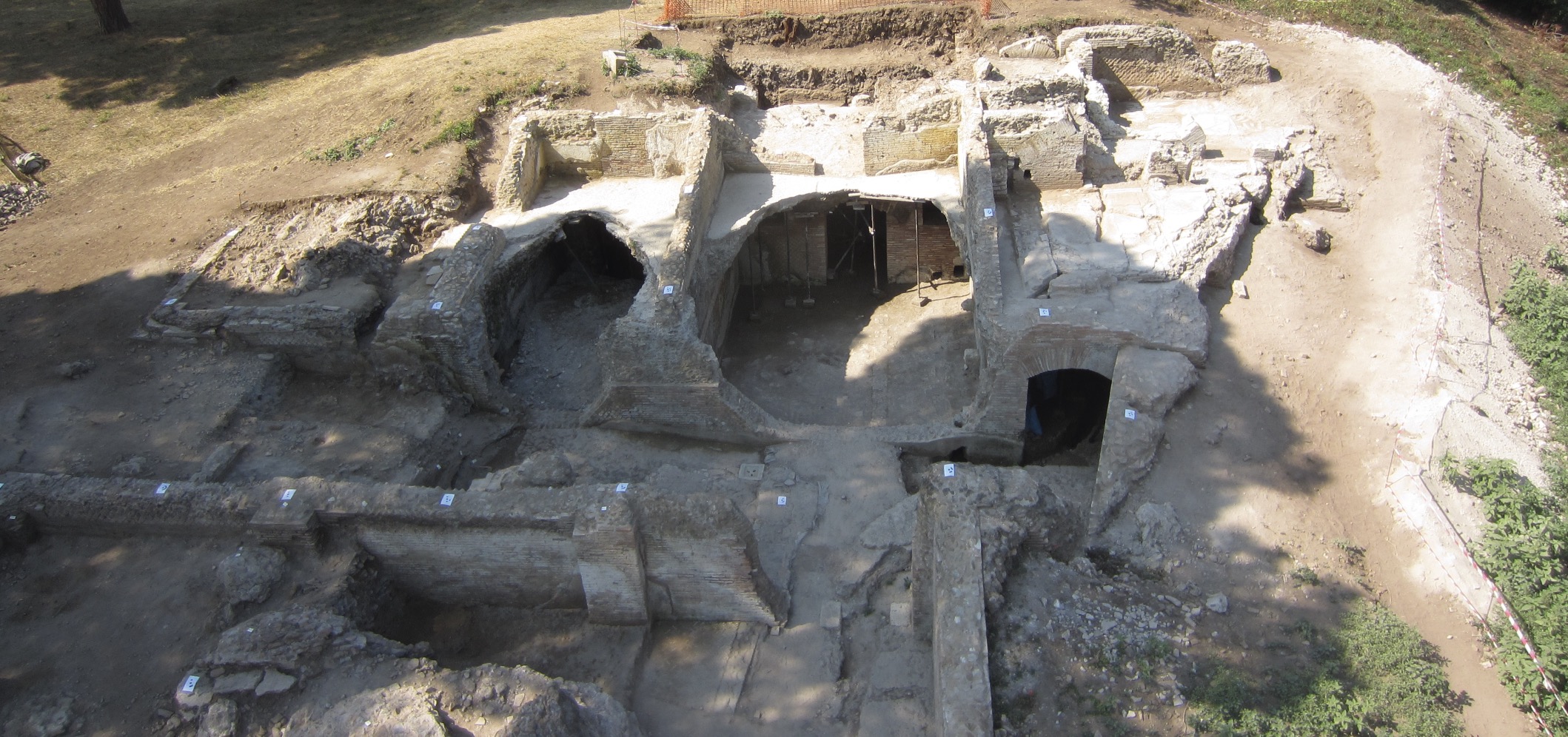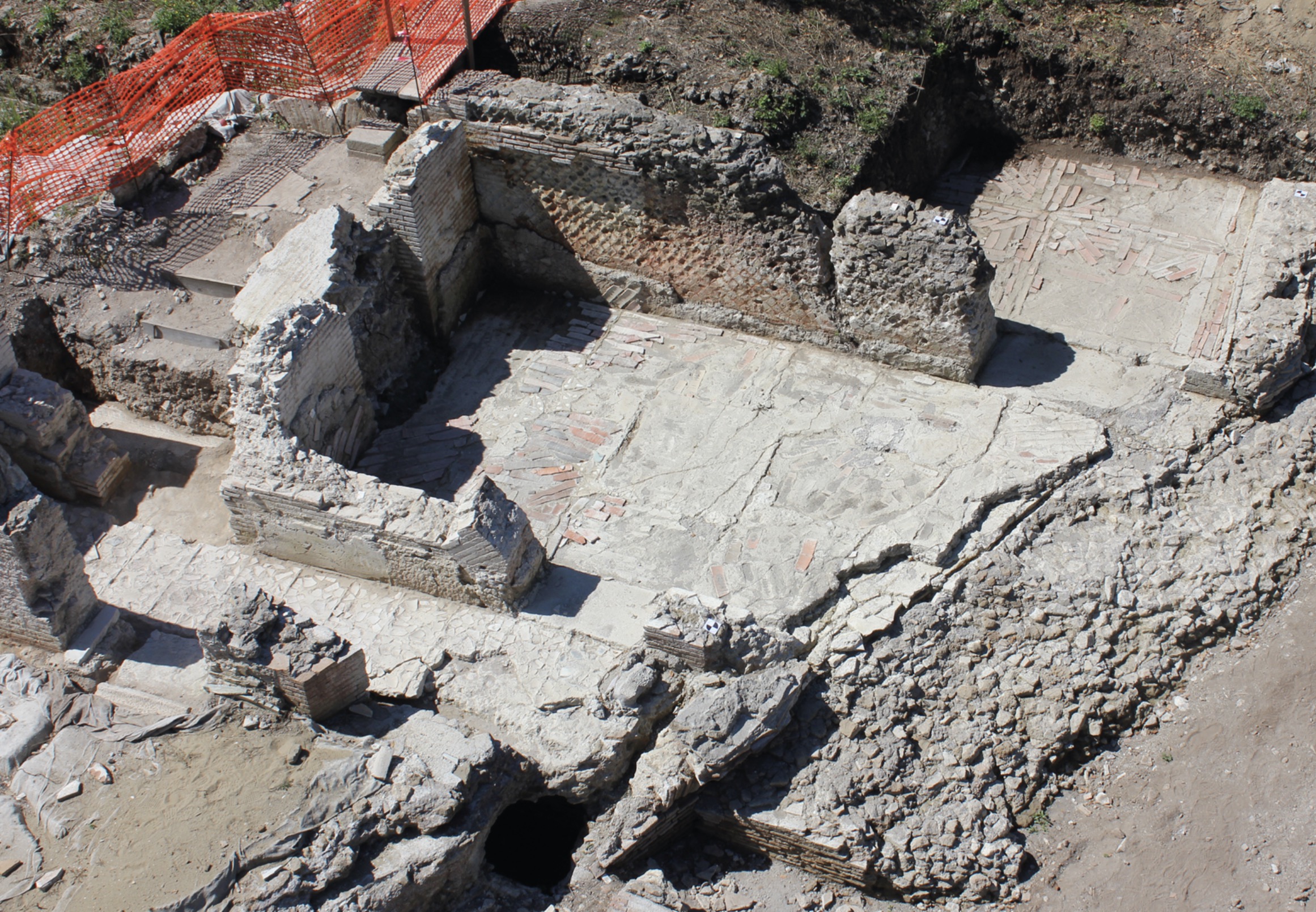Veduta aerea degli ambienti con i livelli preparatori del pavimento in opus sectile