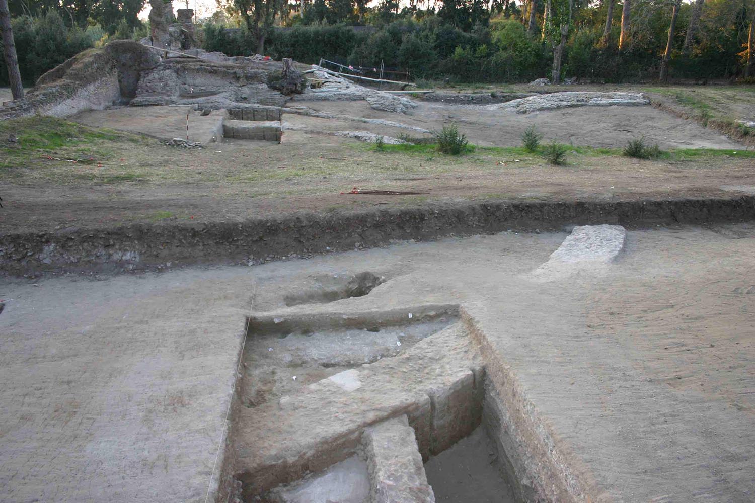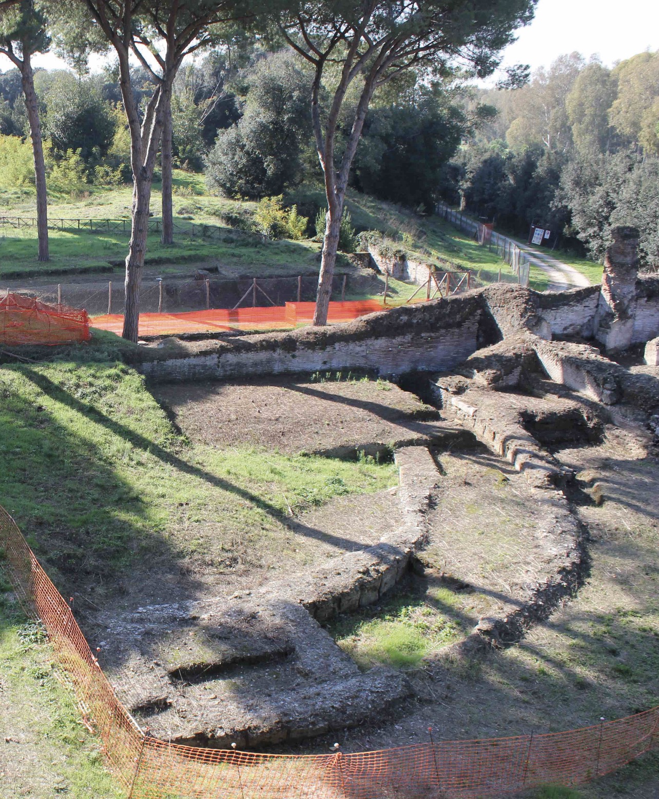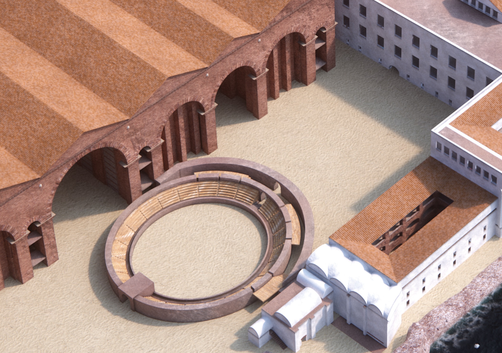 Nello spazio non edificato compreso tra il Palazzo Imperiale e i Navalia, in età severiana (193-235 d.C.) venne realizzato un anfiteatro di ridotte dimensioni, di cui restano due fondazioni concentriche gettate entro casseforma, visibili soprattutto lungo il sentiero moderno; una terza fondazione creava verosimilmente un’esedra. L’edificio, realizzato in opera vittata mista, venne totalmente demolito tra il IV e il V secolo d.C. per far posto a una nuova facciata del Palazzo Imperiale. In seguito l’area su cui sorgeva l’anfiteatro fu attraversata dalle mura tardoantiche, delle quali resta un tratto particolarmente ben conservato e dotato di contrafforti.