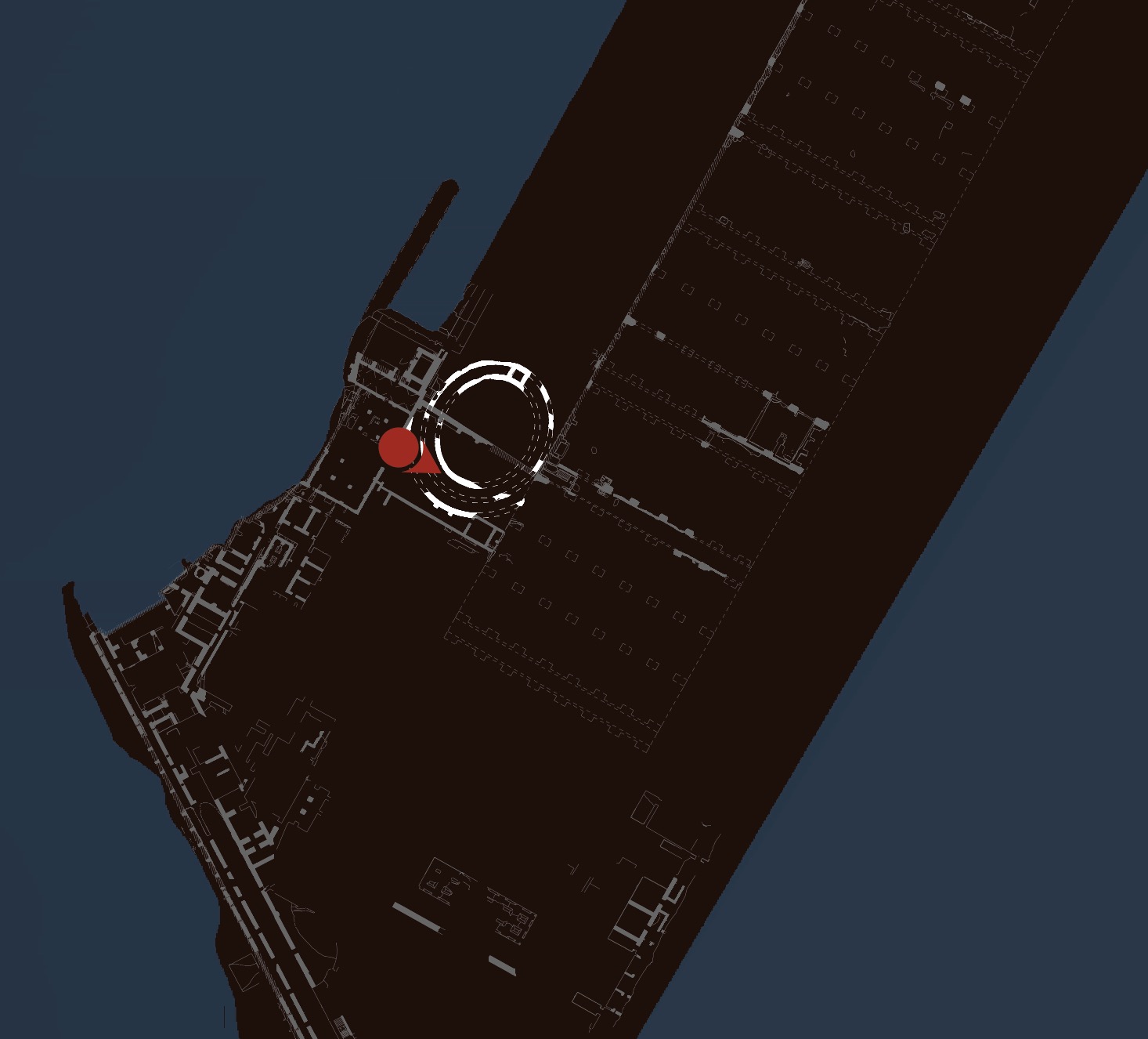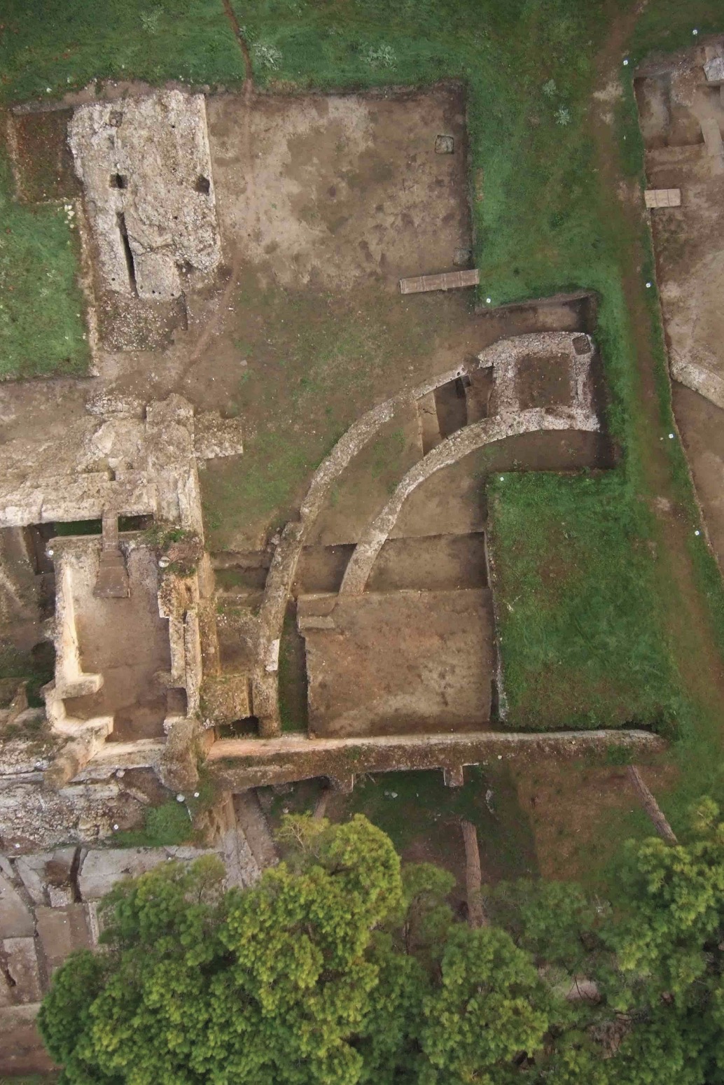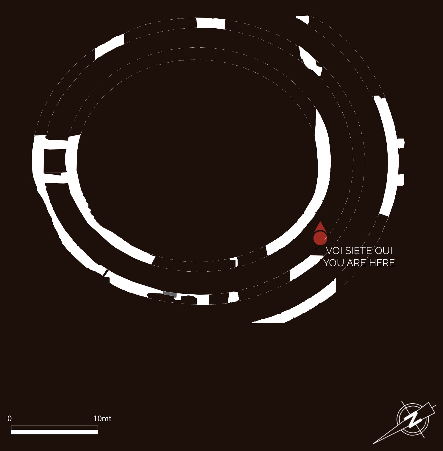 Nello spazio non edificato compreso tra il Palazzo Imperiale e i Navalia, in età severiana (193-235 d.C.) venne realizzato un anfiteatro di ridotte dimensioni, di cui restano due fondazioni concentriche gettate entro casseforma, visibili soprattutto lungo il sentiero moderno; una terza fondazione creava verosimilmente un’esedra. L’edificio, realizzato in opera vittata mista, venne totalmente demolito tra il IV e il V secolo d.C. per far posto a una nuova facciata del Palazzo Imperiale. In seguito l’area su cui sorgeva l’anfiteatro fu attraversata dalle mura tardoantiche, delle quali resta un tratto particolarmente ben conservato e dotato di contrafforti.