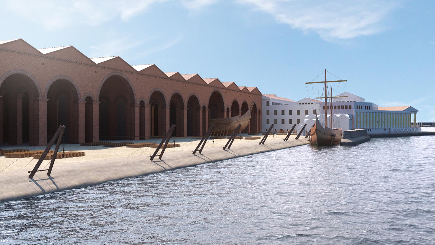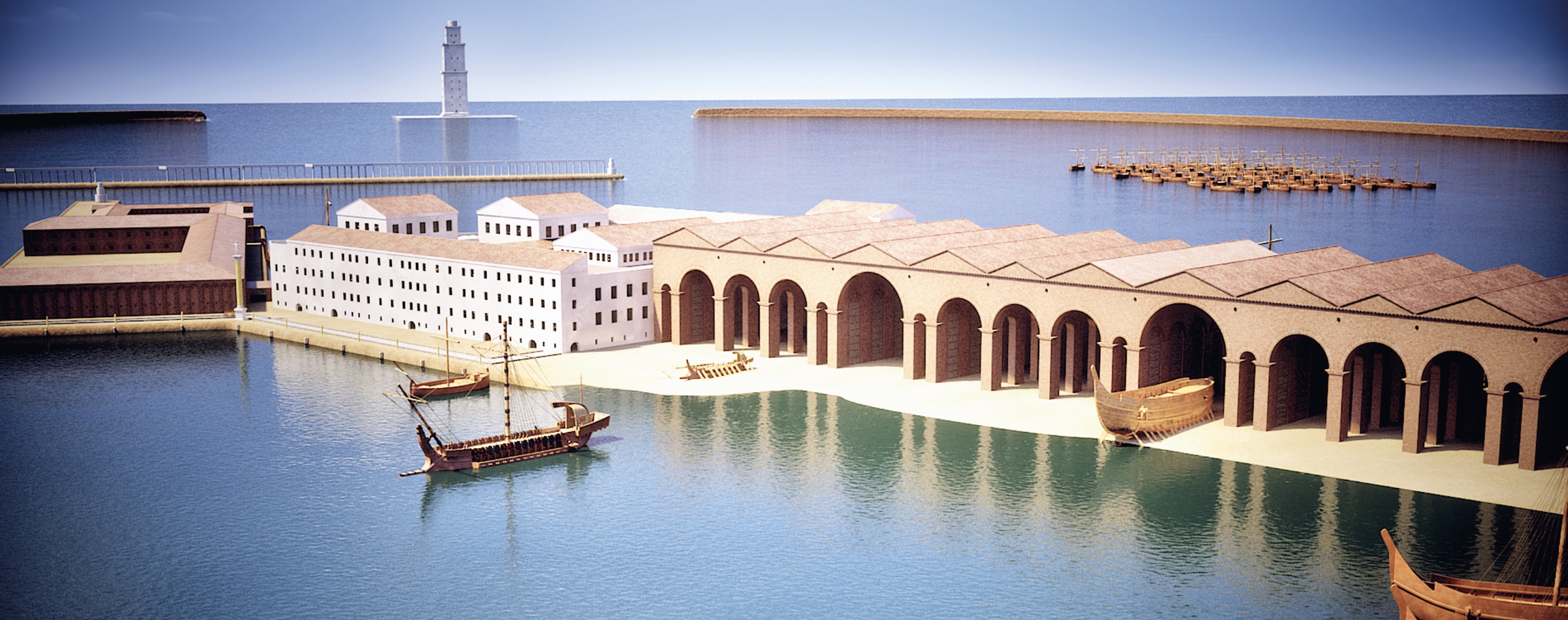 I Navalia erano destinati al ricovero e alla manutenzione di navi militari, come attestato dal ritrovamento di chiodi in bronzo da nave di età traianea (98-117 d.C.). Il complesso, lungo 240 metri, era costituito da tre grandi sezioni modulari identiche affacciate su entrambi i bacini, formate dalla successione di un corridoio largo 4,5 metri, tre navate larghe circa 12 metri, un corridoio largo 5 metri e una navata larga 20 metri. Nel II secolo d.C. parte dell’edificio fu trasformata in magazzino. Sono oggi visibili i lati lunghi di una navata, caratterizzati da grandi pilastri di età traianea inglobati nelle murature successive. In età tardoantica il fronte dei Navalia affacciato sul bacino di Claudio fu chiuso dalle mura e l’area assunse funzione funeraria, come attestato dal rinvenimento di molte sepolture, due delle quali in muratura.