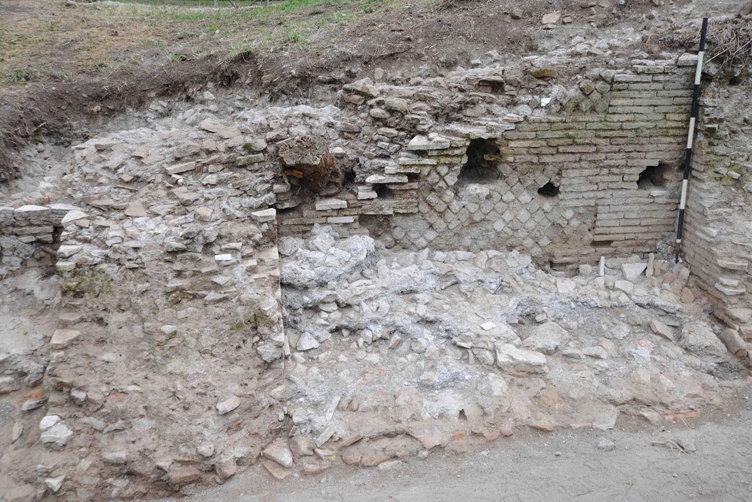 Dettaglio della muratura della facciata settentrionale: al muro di II secolo d.C., compreso tra due contrafforti , si addossano le mura tardoantiche