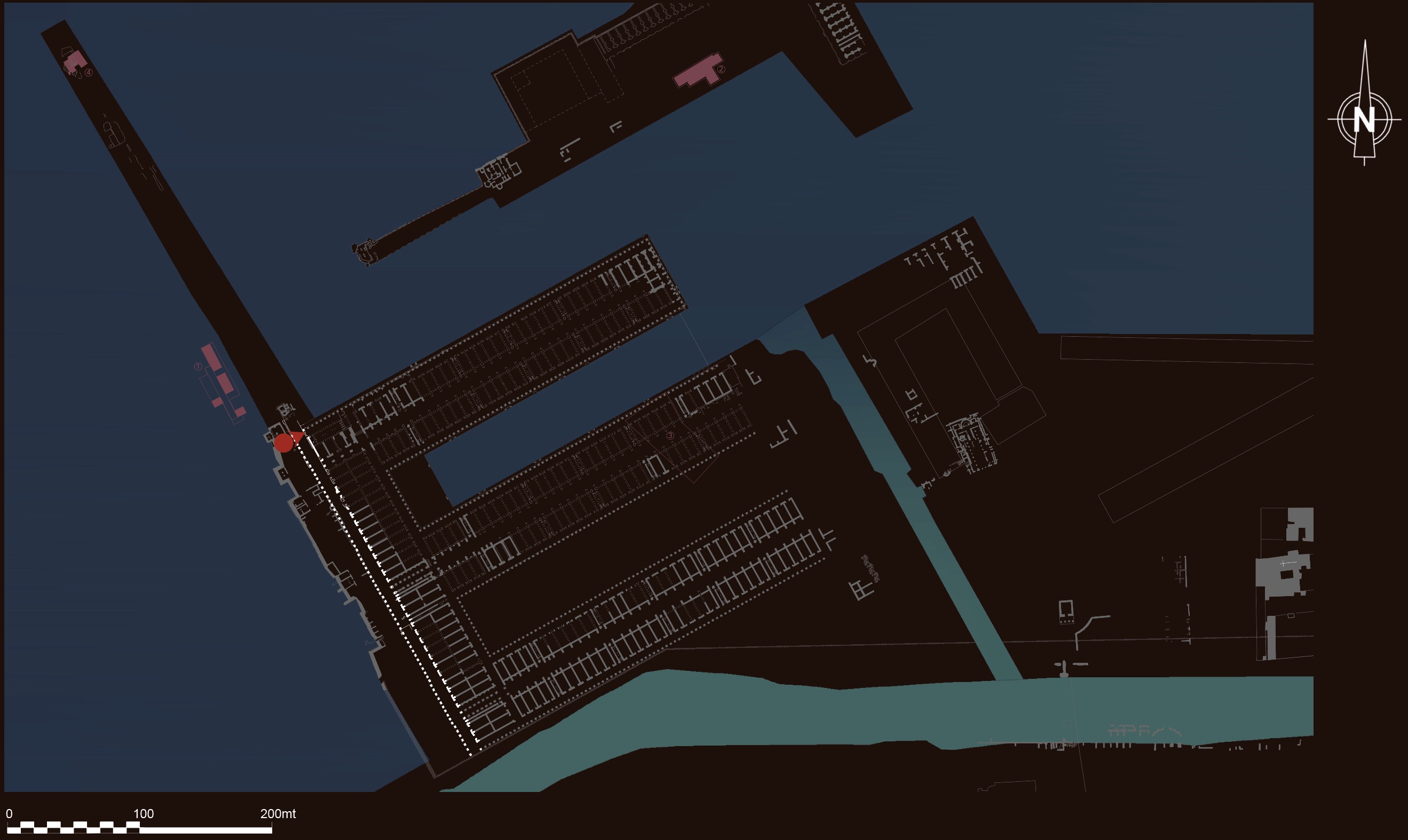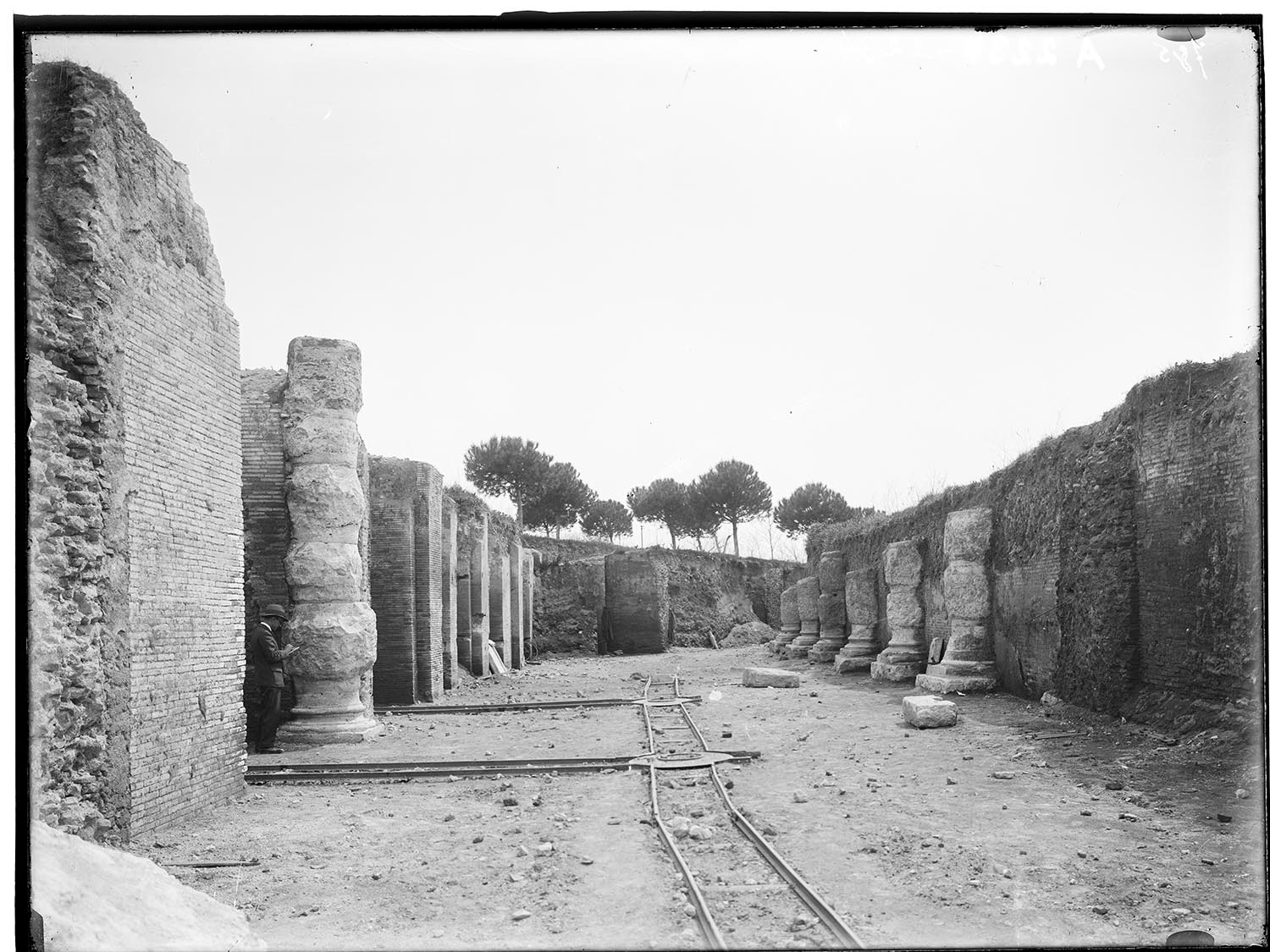 Questo portico monumentale è stato riportato alla luce nel 1933, durante i lavori di bonifica fatti eseguire dal Principe Giovanni Torlonia, ed è perpendicolarmente collegato alla Strada Colonnata. Le colonne di travertino, a fusti grossolanamente scolpiti in stile “bugnato rustico”, correvano originariamente anche intorno agli altri tre corpi di fabbrica del complesso dei Magazzini Traianei, lungo le banchine e intorno alla darsena. La particolare tipologia stilistica del colonnato costituisce uno dei tratti distintivi dell’architettura claudiana, riscontrabili in altri monumenti attribuiti allo stesso imperatore, quali Porta Maggiore e il Tempio del Divo Claudio a Roma. Rimangono oggi poche colonne ad attestare la monumentalità del portico, ma in realtà lo stesso si estendeva davanti ai Magazzini Traianei per più di mezzo chilometro, dalle sponde della Fossa Traiana all'estremità settentrionale del molo nord-sud, e offriva a ogni imbarcazione che entrava in porto la vista di un lungo e maestoso prospetto, immagine della magnificenza di Roma.