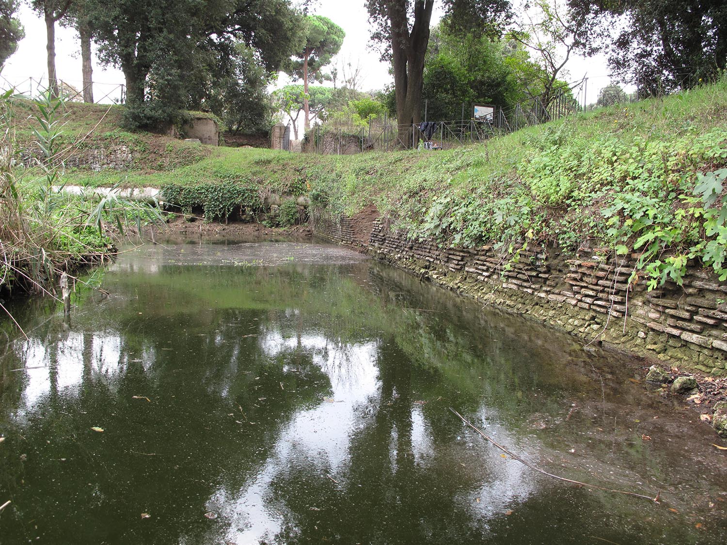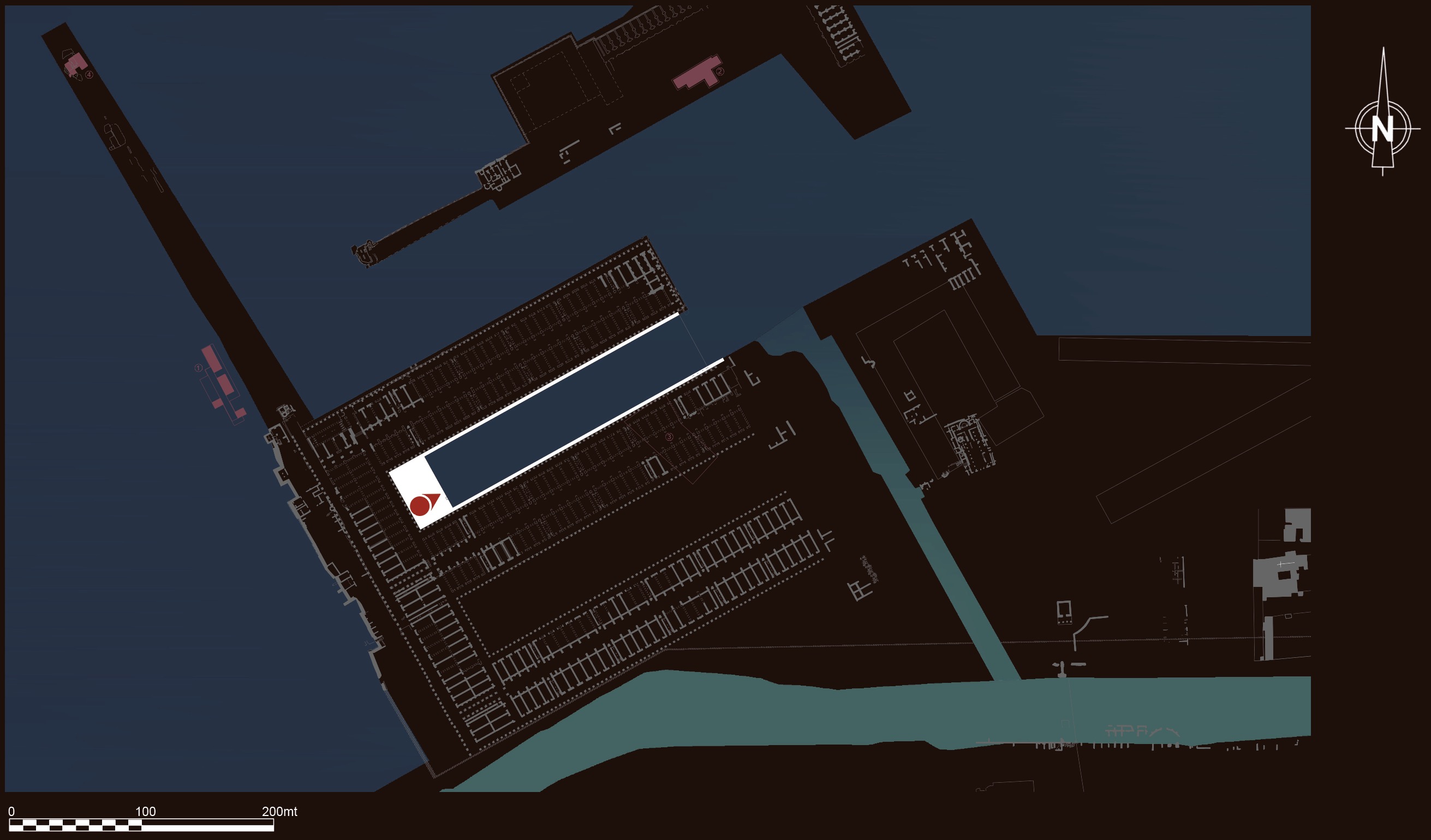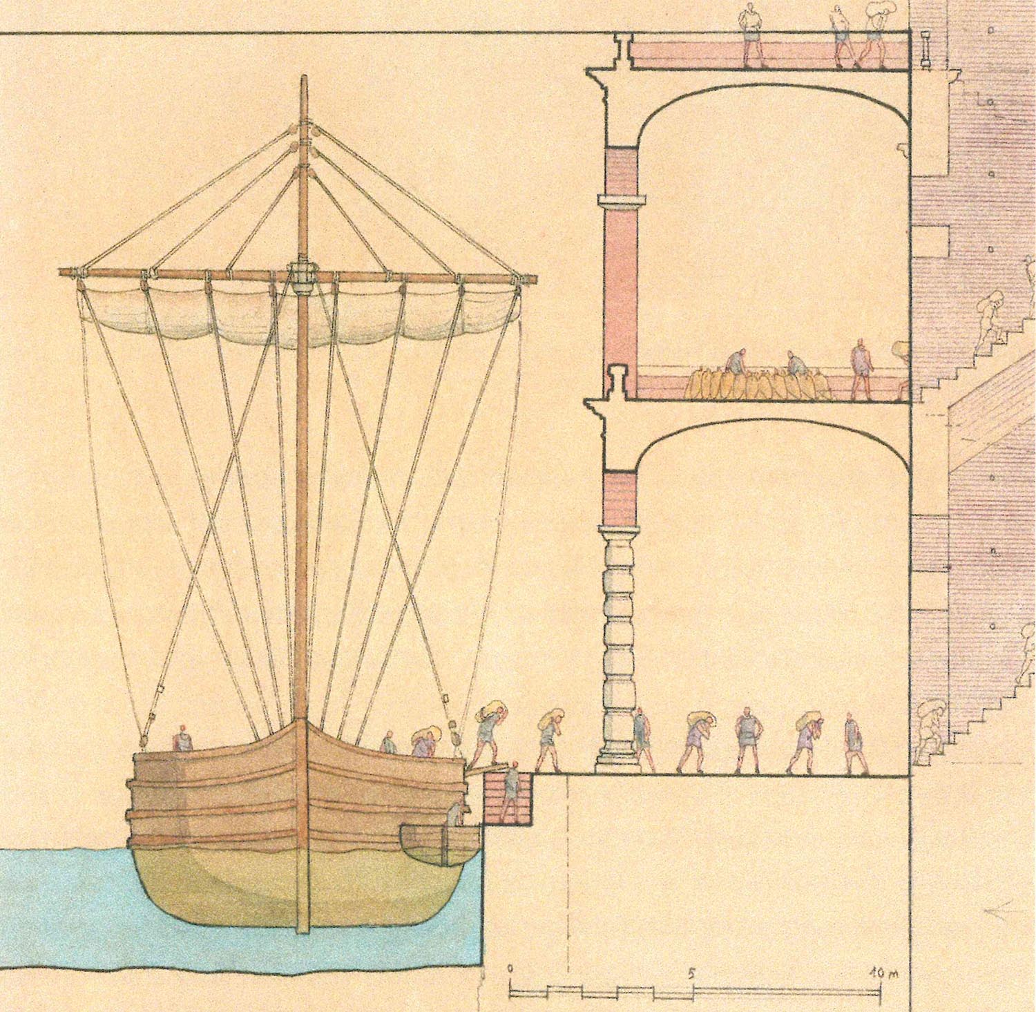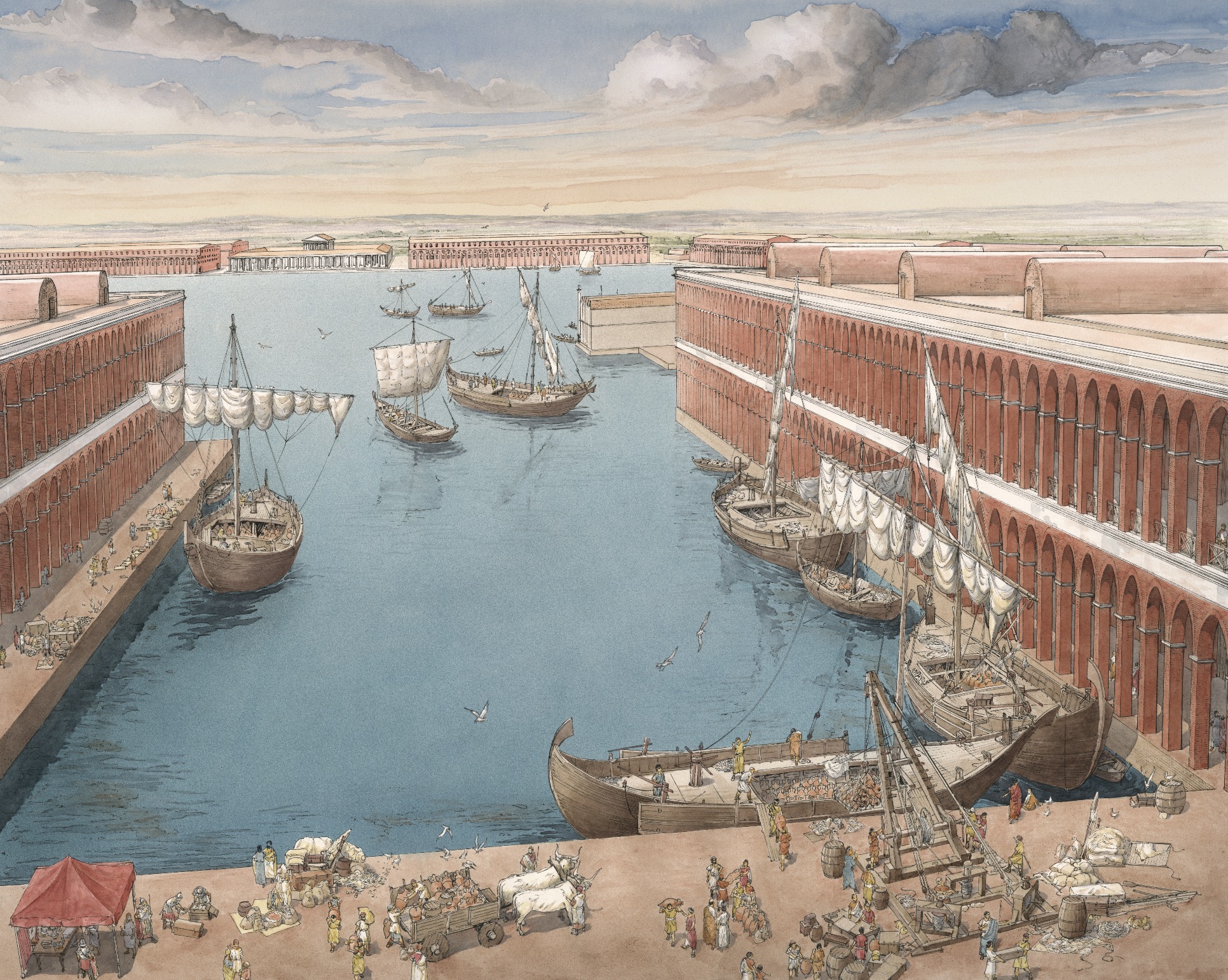 La Darsena è un vasto bacino rettangolare delimitato su tre lati dai Magazzini Traianei. Già prevista nell’originario progetto del porto di Claudio con funzione di bacino interno, ha conosciuto almeno due grandi fasi costruttive: la prima in epoca claudio-neroniana (42-68 d.C.), testimoniata dal rinvenimento di un bollo laterizio nelle più antiche strutture delle banchine; la seconda in età severiana (193-235 d.C.), quando i colonnati dei portici dei magazzini vengono chiusi per aumentare le capacità di stoccaggio del complesso e la banchina viene notevolmente ampliata lungo tutto il perimetro. La profondità del bacino è stimata intorno agli 8 metri, ma non è stato possibile stabilire se il fondo fosse pavimentato, come nel caso del bacino esagonale e della Fossa Traiana. Le sponde, analogamente al porto di Traiano, erano costruite “a scarpa”, al fine di attenuare il moto ondoso. La Darsena era destinata ad accogliere imbarcazioni di pescaggio ridotto ed era utilizzata verosimilmente come rimessaggio delle naves caudicariae (chiatte destinate alla navigazione fluviale).