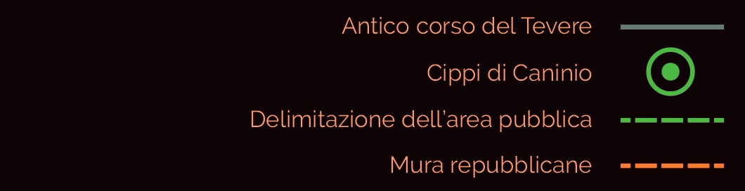 I cippi in travertino, che prendevano il nome dal pretore Caio Caninio, delimitavano un’area pubblica posta tra il Tevere e il Decumano nel settore orientale della città; essa era destinata alle attività di scarico, di trasporto e di stoccaggio delle merci e, pertanto, sottoposta al divieto di edificare costruzioni private. I cippi sono datati a età tardo-repubblicana, intorno al 140 a.C., e testimoniano il potenziamento dello scalo portuale di Ostia, legato alle riforme economiche e sociali dei Gracchi. L’innalzamento progressivo del livello della strada e l’occupazione della fascia pubblica da parte dei complessi di epoca imperiale sancirono la definitiva perdita di funzione dei cippi stessi.