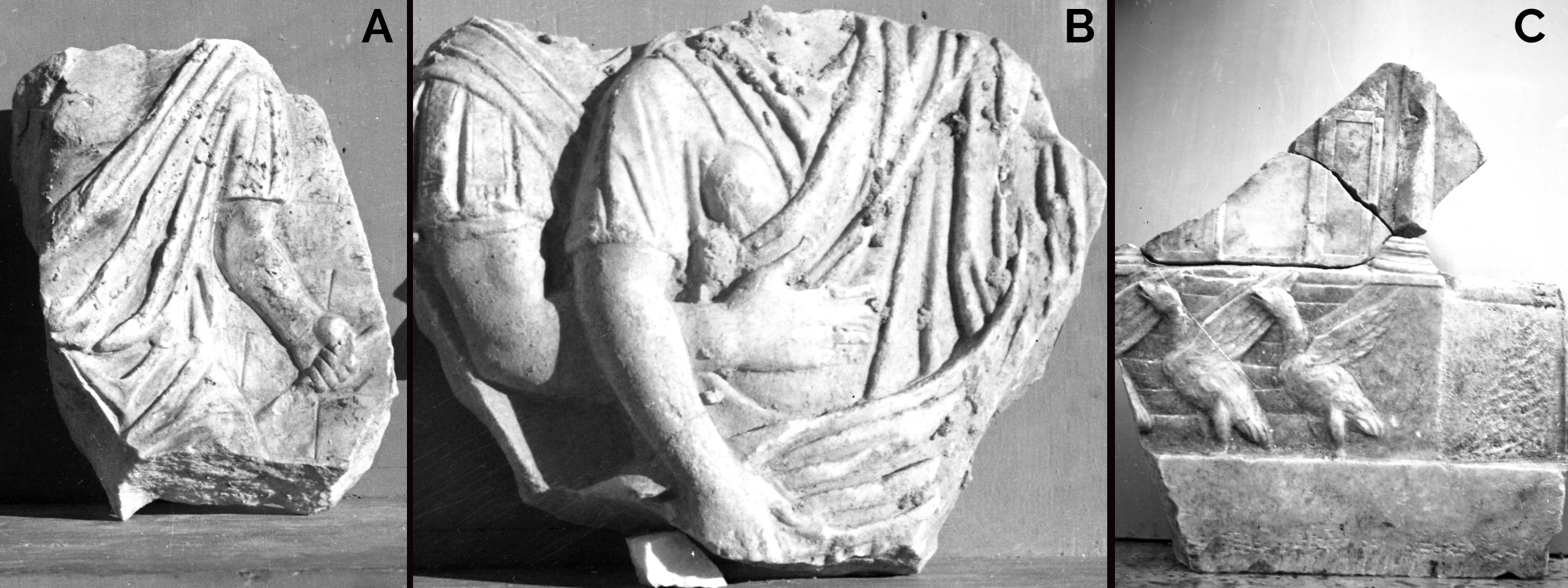 Frammenti di rilievi con rappresentazione di scena di costruzione di mura (A), ratto delle Sabine (B), oche del Campidoglio (C)