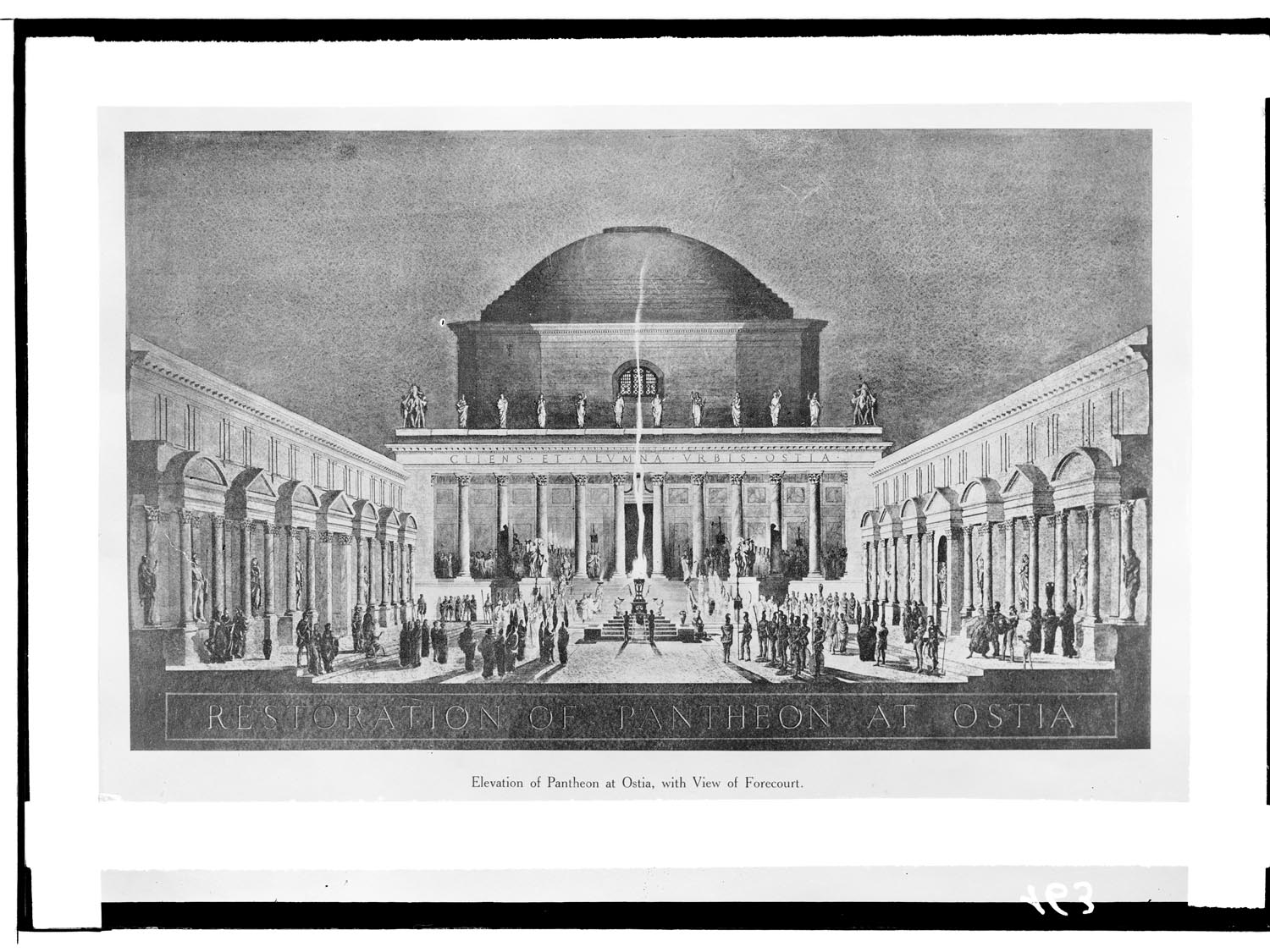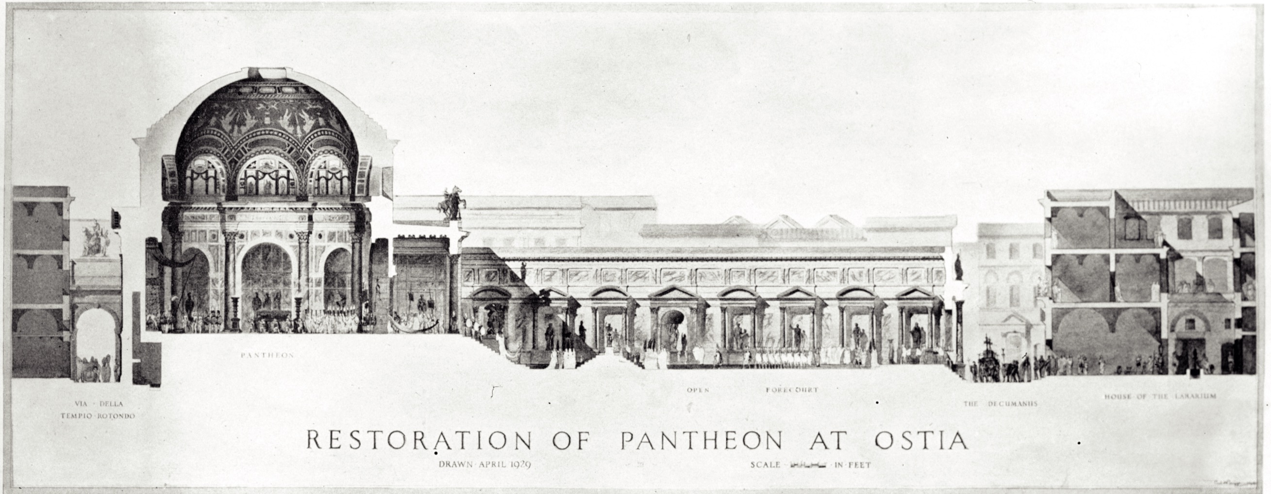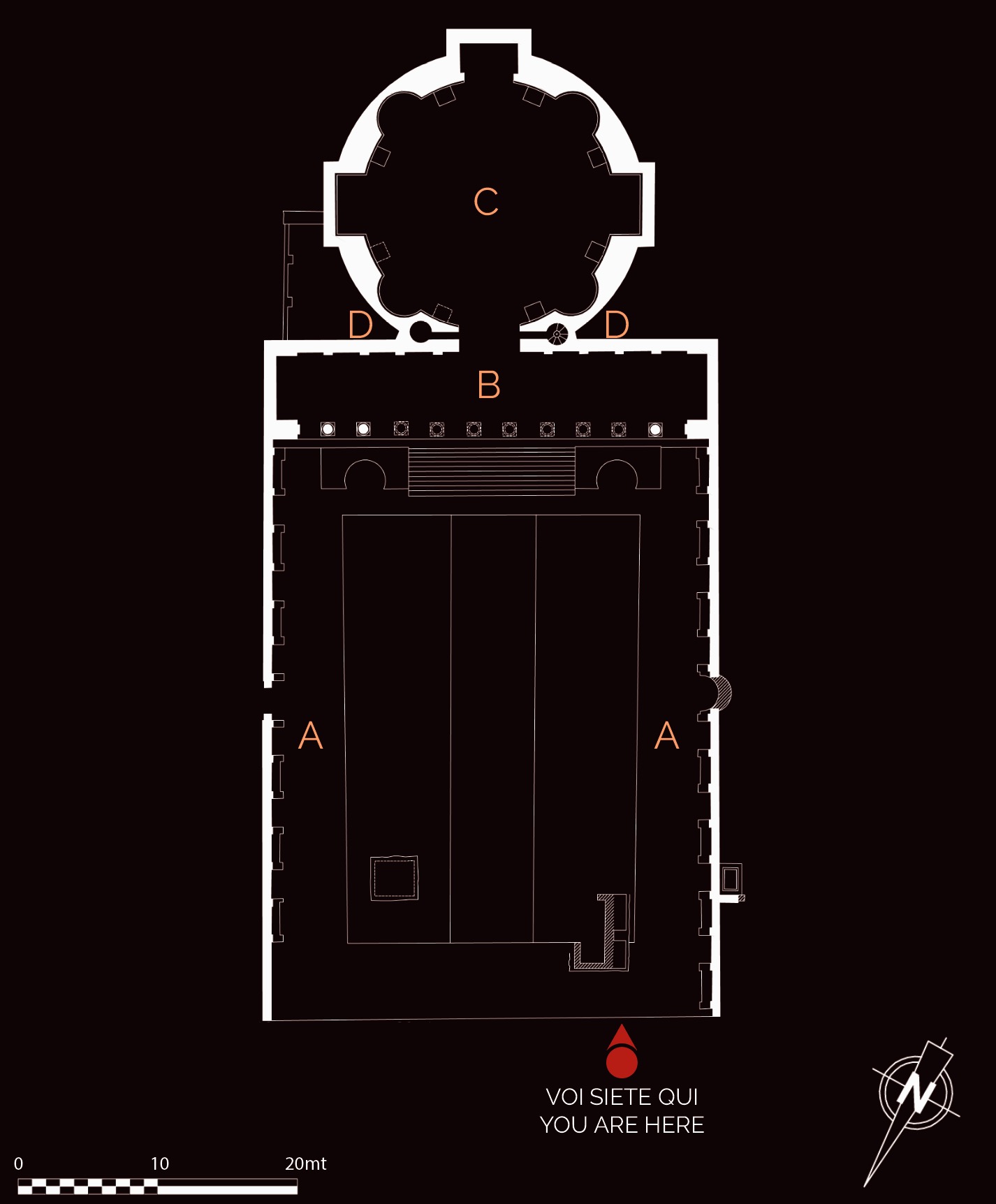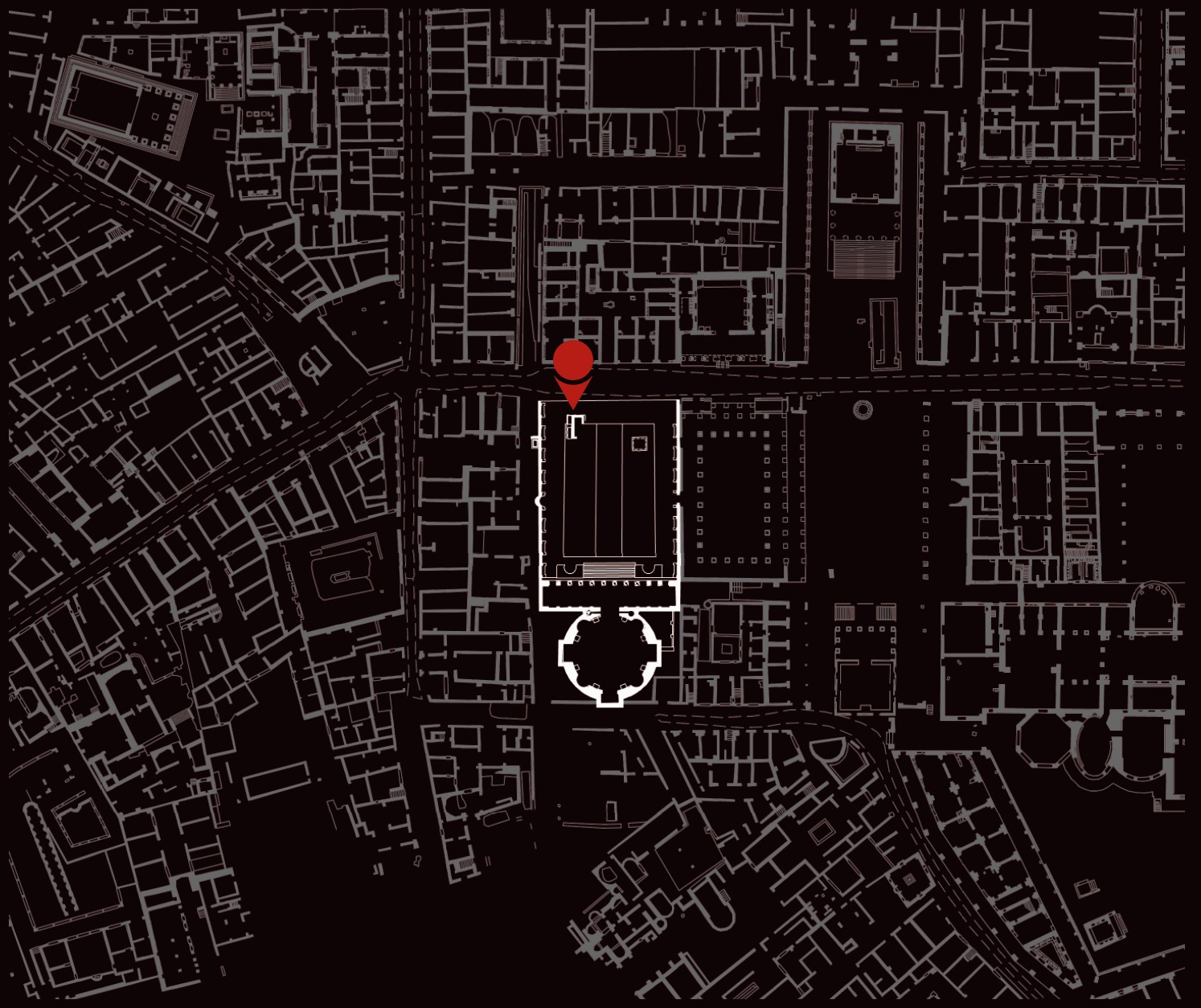 Il tempio fu costruito nella prima metà del III secolo d.C., in un’area precedentemente occupata da una piazza accessibile dalla Basilica. Il complesso, dall’aspetto grandioso e scenografico, era costituito da un recinto decorato con nicchie (A) e dall’edificio di culto vero e proprio, posto sul lato di fondo. Quest’ultimo, accessibile da una scala monumentale, presentava un pronao (B) con dieci colonne di pregiato marmo greco e una grande cella circolare con nicchie per statue (C). La volta a cupola, che copriva la cella, poteva essere raggiunta mediante due scale a chiocciola (D), una delle quali molto ben conservata. È probabile che il tempio fosse adibito al culto imperiale, come suggerisce il rinvenimento, nei pressi, di frammenti di teste colossali di imperatori della dinastia dei Severi (III secolo d.C.).