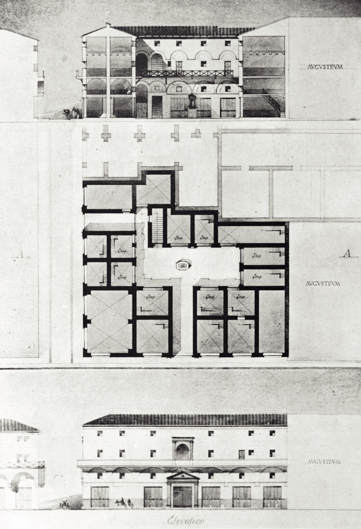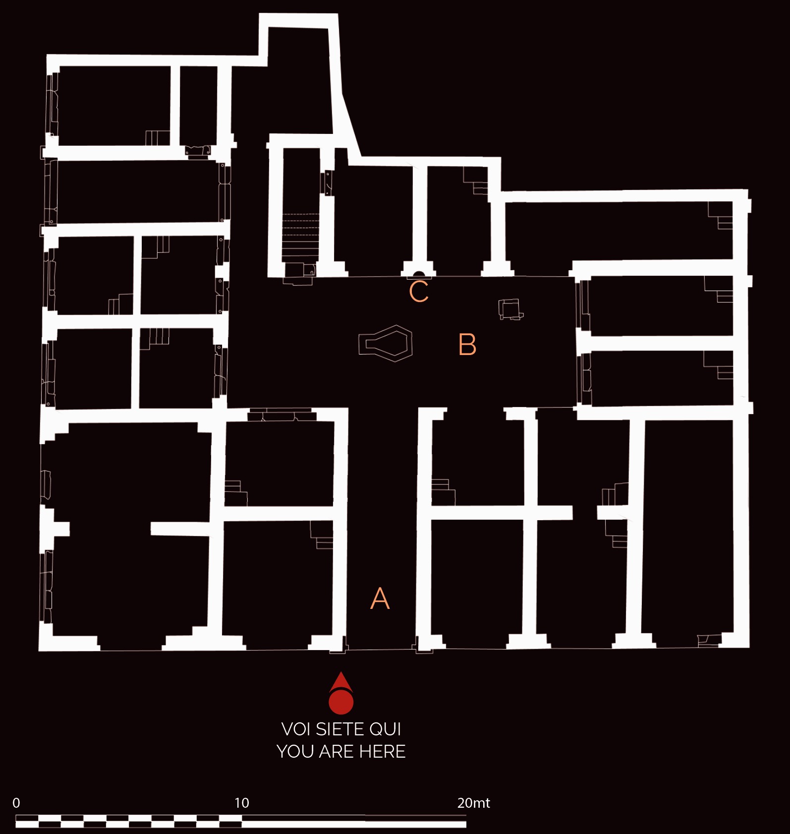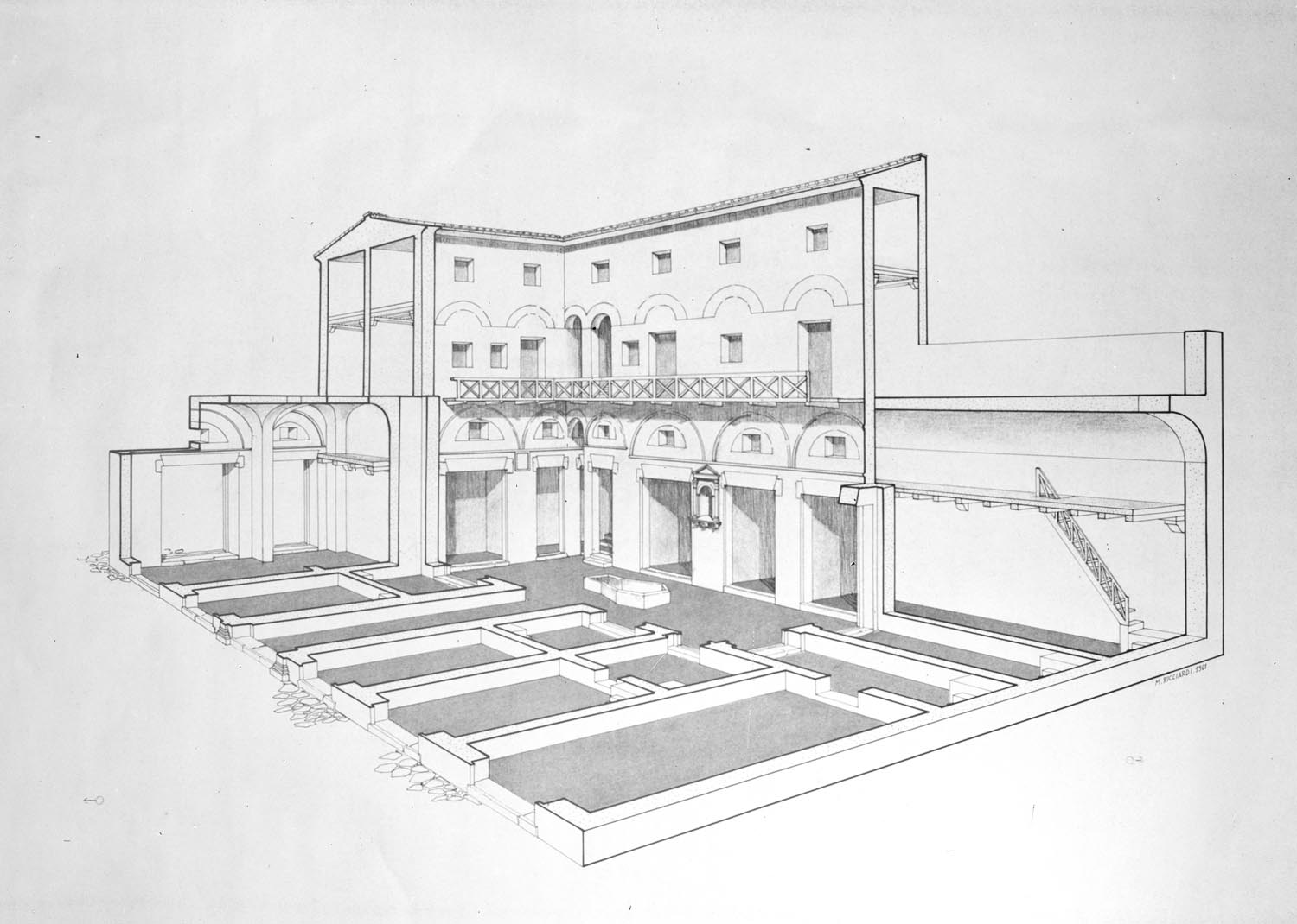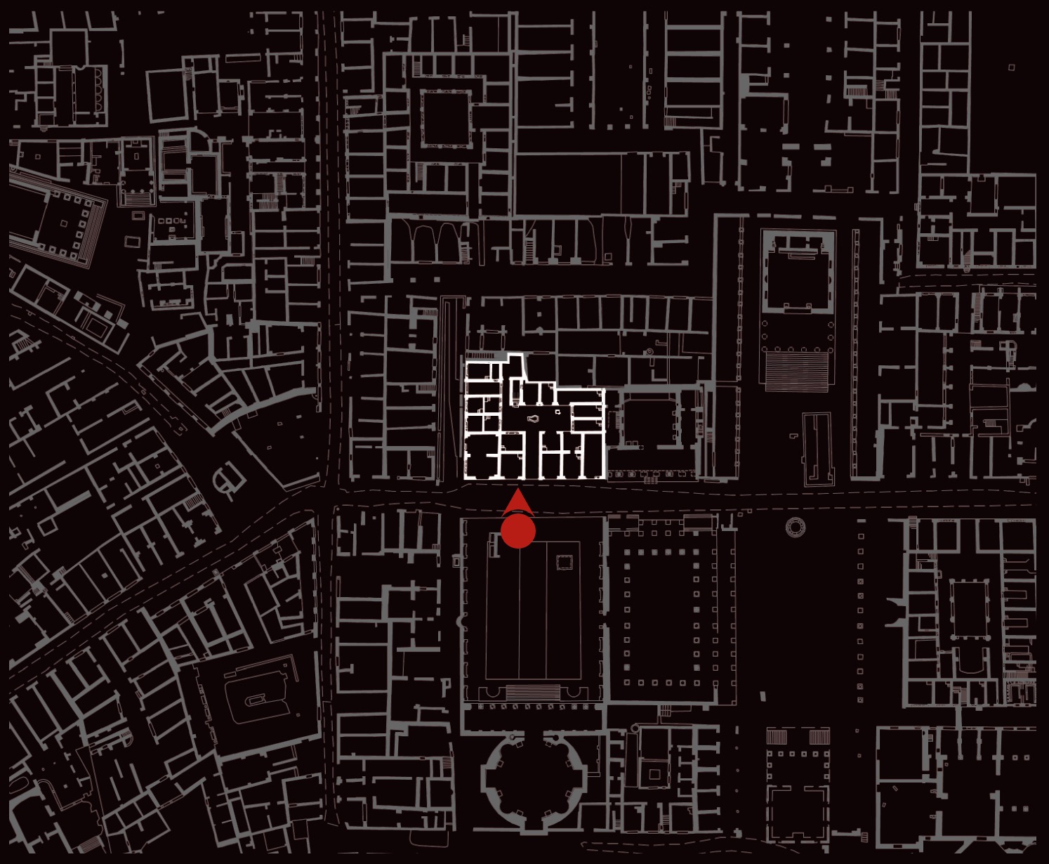 Questo caseggiato, costruito intorno al 120 d.C., era probabilmente destinato alla vendita di generi di lusso, come suggerito dalla posizione nelle immediate vicinanze del Foro e dall’aspetto particolarmente curato. Occupato sui lati sud e ovest da una fila di tabernae aperte verso la strada, si articolava intorno a un cortile centrale con vasca e pozzo (B). Il cortile era impreziosito da un’edicola policroma in cui può essere riconosciuto un lararium (C), ovvero uno spazio dedicato al culto delle divinità protettrici della casa o della comunità. Su tutti i lati del cortile si affacciavano ambienti disposti su due livelli: i locali al pianterreno erano occupati da botteghe, mentre i mezzanini servivano come abitazioni. Il rinvenimento di una vera di pozzo in marmo che reca il nome del patronus del collegio dei mensores ha portato a ipotizzare che qui potesse trovarsi anche la sede del collegio stesso.