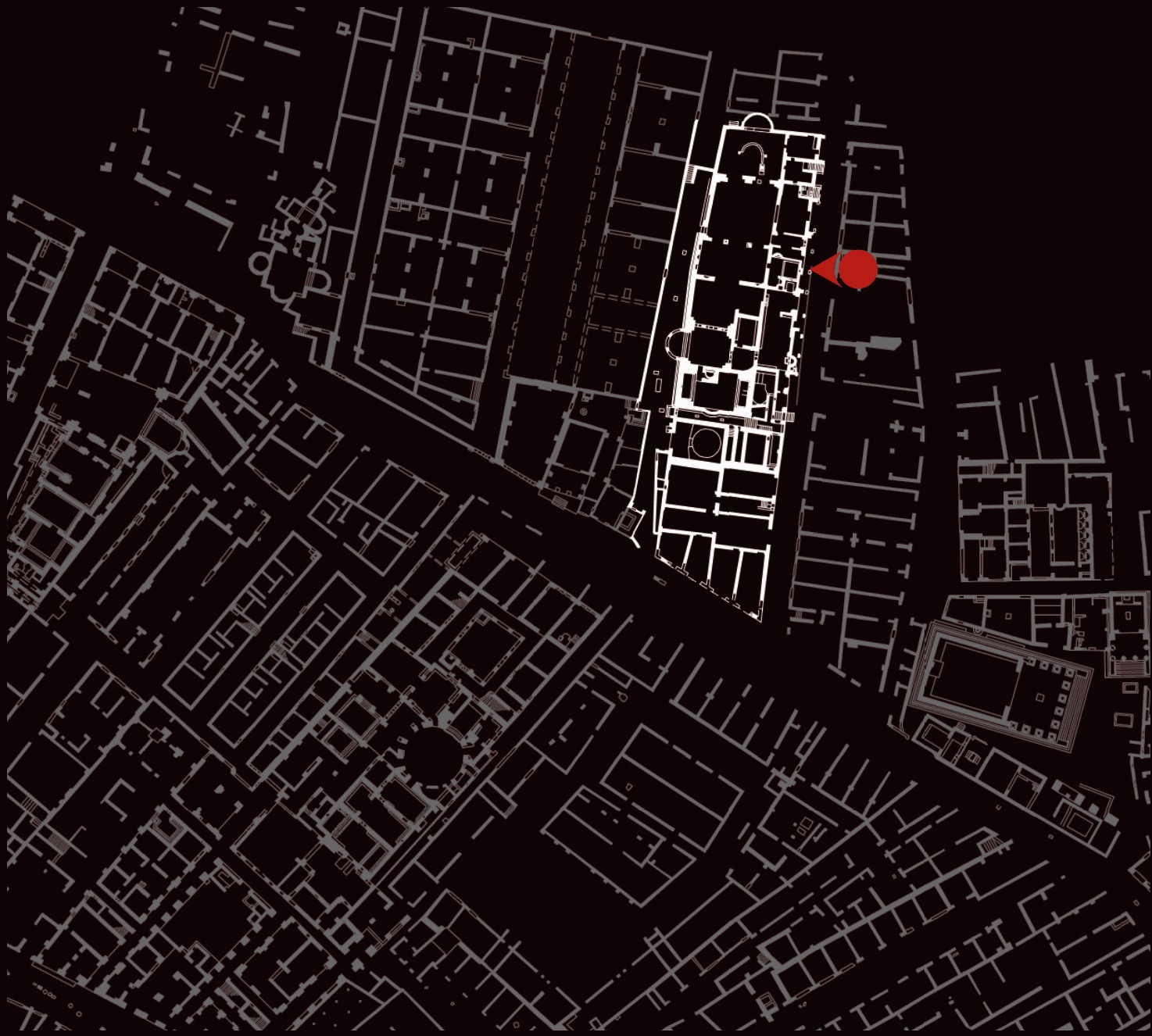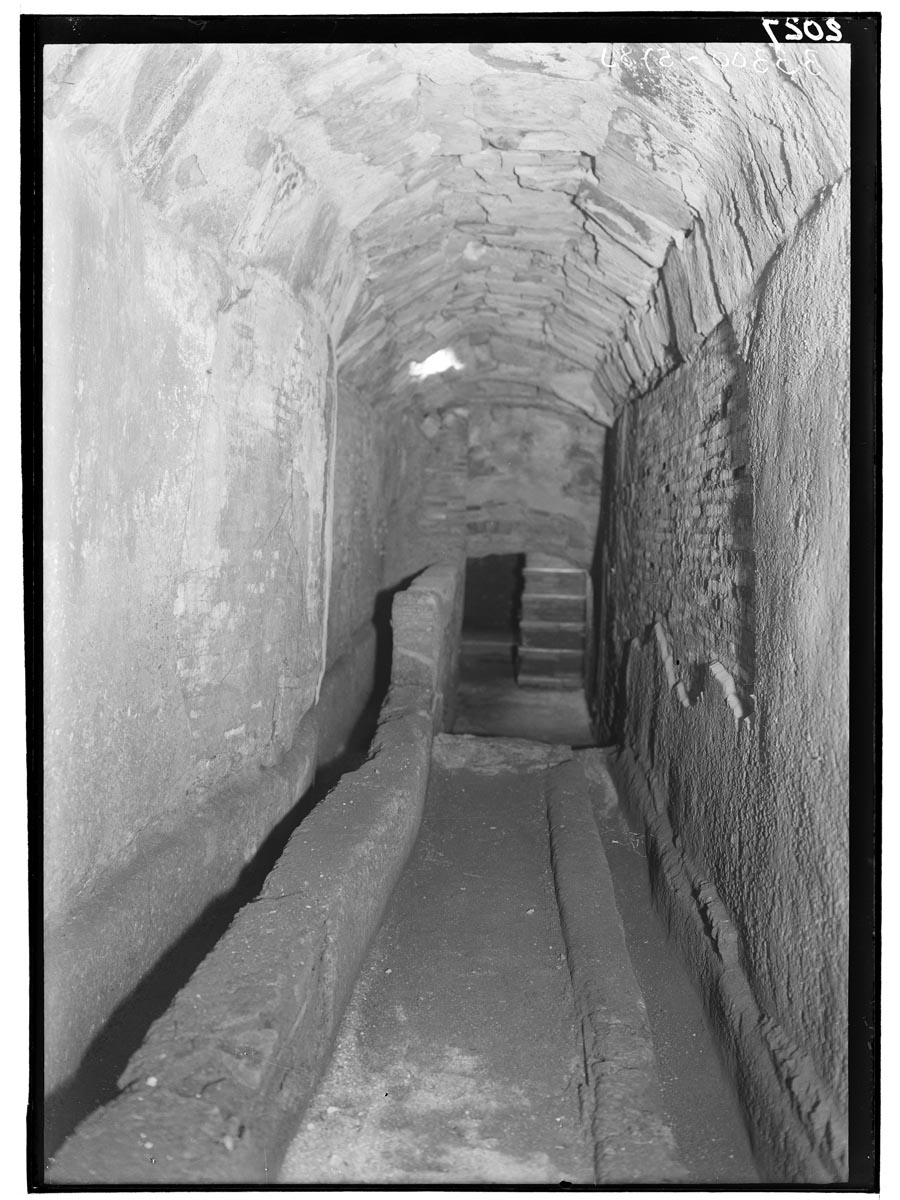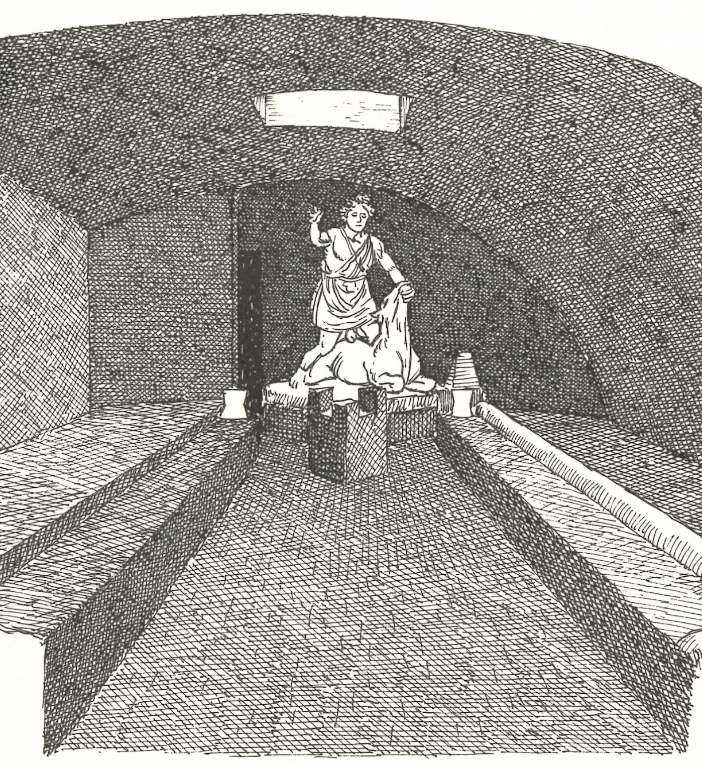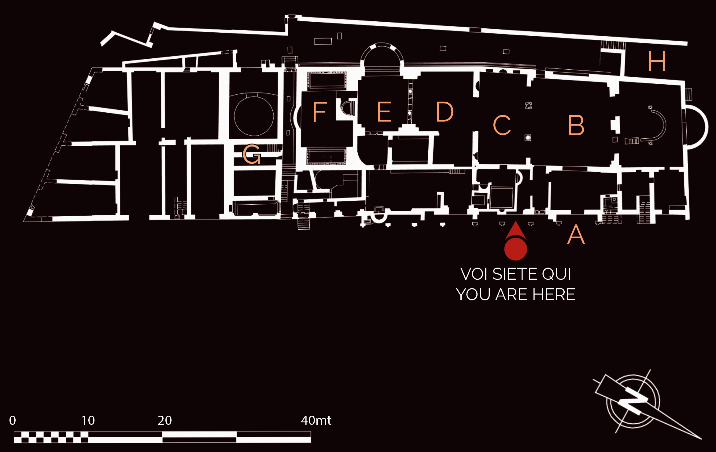 Queste terme private, costruite in età adrianea (117-138 d.C.), ospitavano nel settore sud gli ambienti riscaldati (D-F), mentre la parte nord era occupata dalla sala principale (B), separata mediante due colonne dal frigidarium (sala per i bagni freddi) decorato con un mosaico figurato (C) e da una stanza in seguito adattata a spazio di culto cristiano. Le terme comprendevano inoltre vani di servizio, in uno dei quali era collocata la ruota idraulica (noria) che prelevava, sollevandola, l’acqua dal sottosuolo (G). Una scala esterna conduceva a un ambiente sotterraneo di servizio delle terme, in cui fu installato un mitreo (H). Si conservano i podia (banchine laterali) e i due pilastrini su cui poggiavano i tronchi di piramide che simboleggiavano la pietra da cui era nato Mitra; sul fondo era posta la statua di culto raffigurante Mitra che uccide il toro, di cui oggi è presente un calco, mentre l’originale è conservato nel Museo Ostiense.