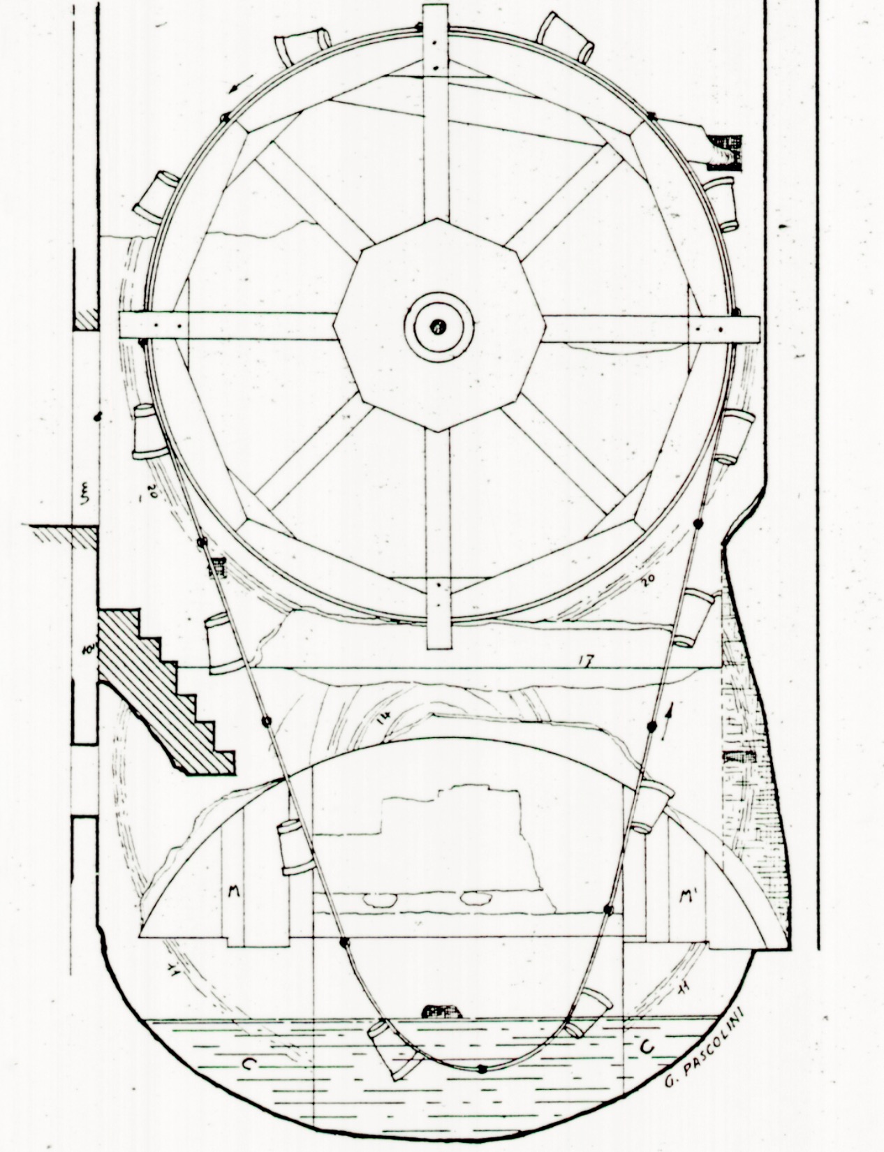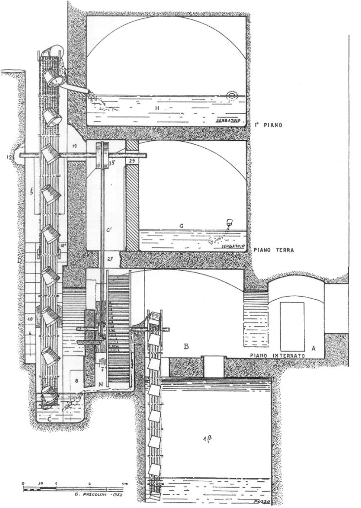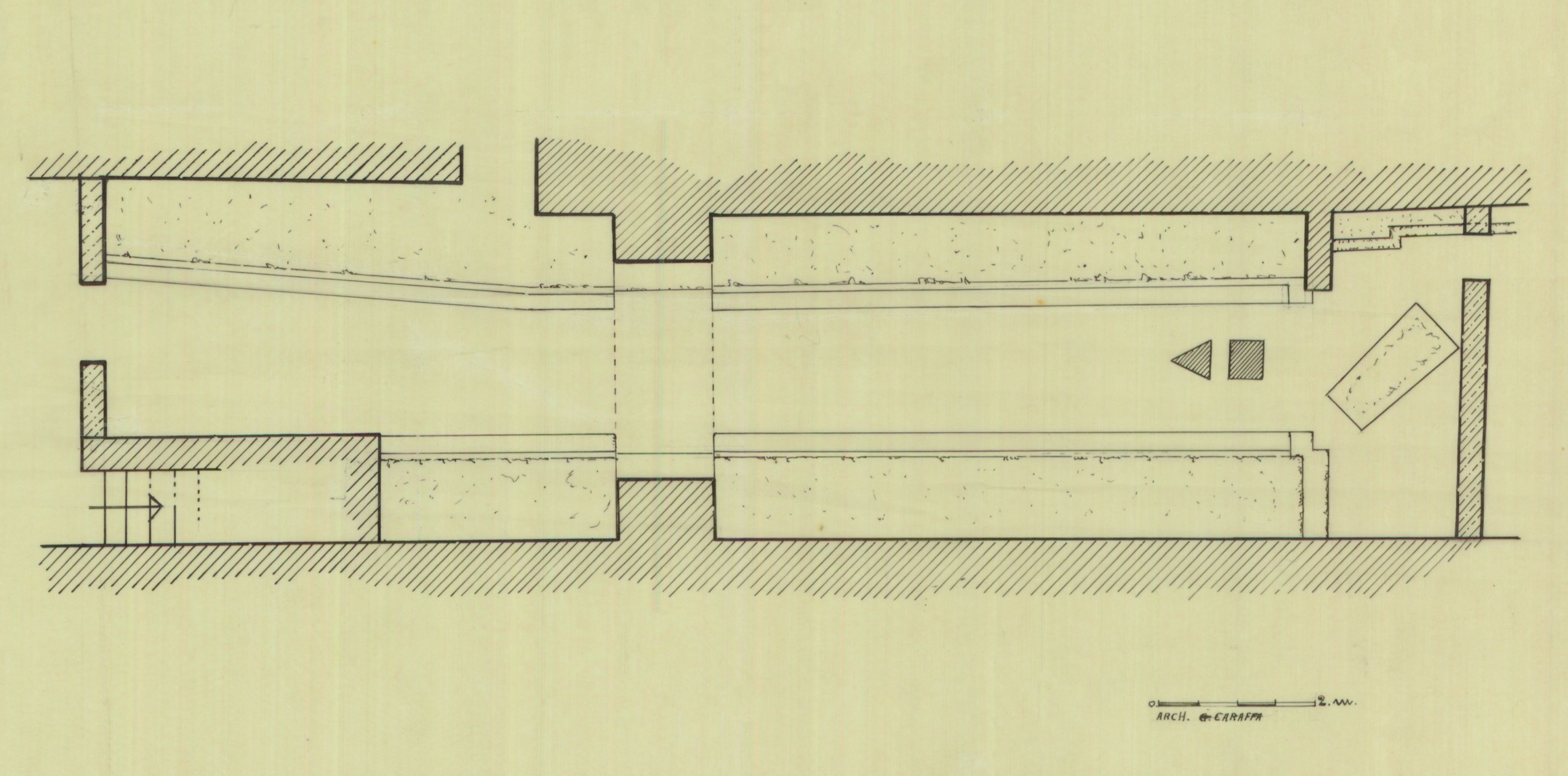 Queste terme private, costruite in età adrianea (117-138 d.C.), ospitavano nel settore sud gli ambienti riscaldati (D-F), mentre la parte nord era occupata dalla sala principale (B), separata mediante due colonne dal frigidarium (sala per i bagni freddi) decorato con un mosaico figurato (C) e da una stanza in seguito adattata a spazio di culto cristiano. Le terme comprendevano inoltre vani di servizio, in uno dei quali era collocata la ruota idraulica (noria) che prelevava, sollevandola, l’acqua dal sottosuolo (G). Una scala esterna conduceva a un ambiente sotterraneo di servizio delle terme, in cui fu installato un mitreo (H). Si conservano i podia (banchine laterali) e i due pilastrini su cui poggiavano i tronchi di piramide che simboleggiavano la pietra da cui era nato Mitra; sul fondo era posta la statua di culto raffigurante Mitra che uccide il toro, di cui oggi è presente un calco, mentre l’originale è conservato nel Museo Ostiense.