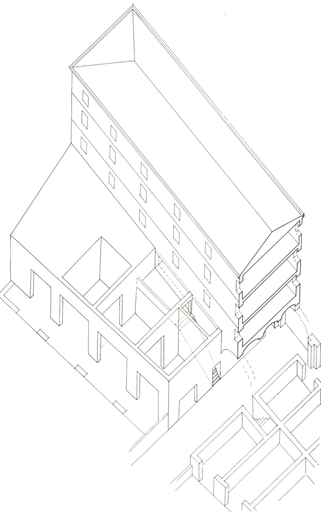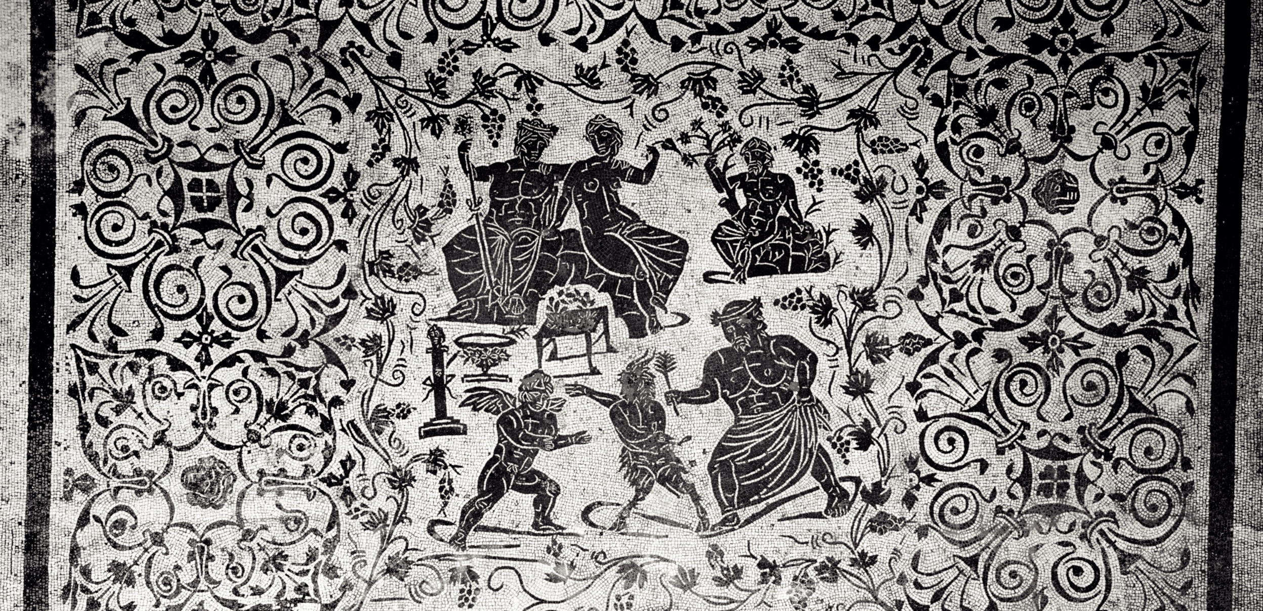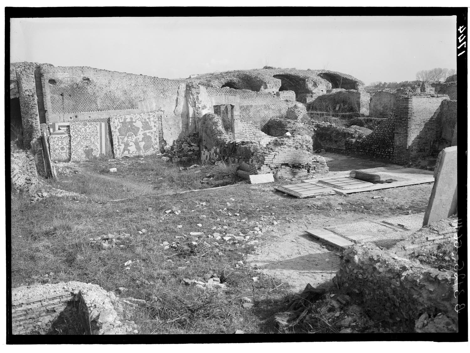 Il caseggiato fu costruito in età adrianea (117-138 d.C.) ed era forse in collegamento con il vicino tempio di Serapide. E’ caratterizzato da un ampio cortile con una vasca al centro (A) e da un portico (B) sul lato settentrionale, su cui si affacciano vari ambienti: tra questi, una sala da pranzo (C), il cui pavimento è decorato con un mosaico che presenta nel settore centrale motivi vegetali e uccelli e, nello spazio tra i letti tricliniari, una testa di Medusa tra figurine alate. La vasta sala attigua alla precedente (D) è invece abbellita da un pavimento in mosaico, con una scena in cui sono raffigurati Bacco e Arianna mentre assistono alla lotta tra Eros e Pan (che simboleggiano rispettivamente l’amore e la passione carnale). I mosaici appartengono tutti alla fase adrianea, mentre il caseggiato mostra rifacimenti databili al III secolo d.C.
