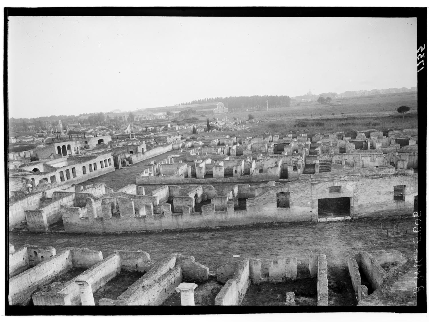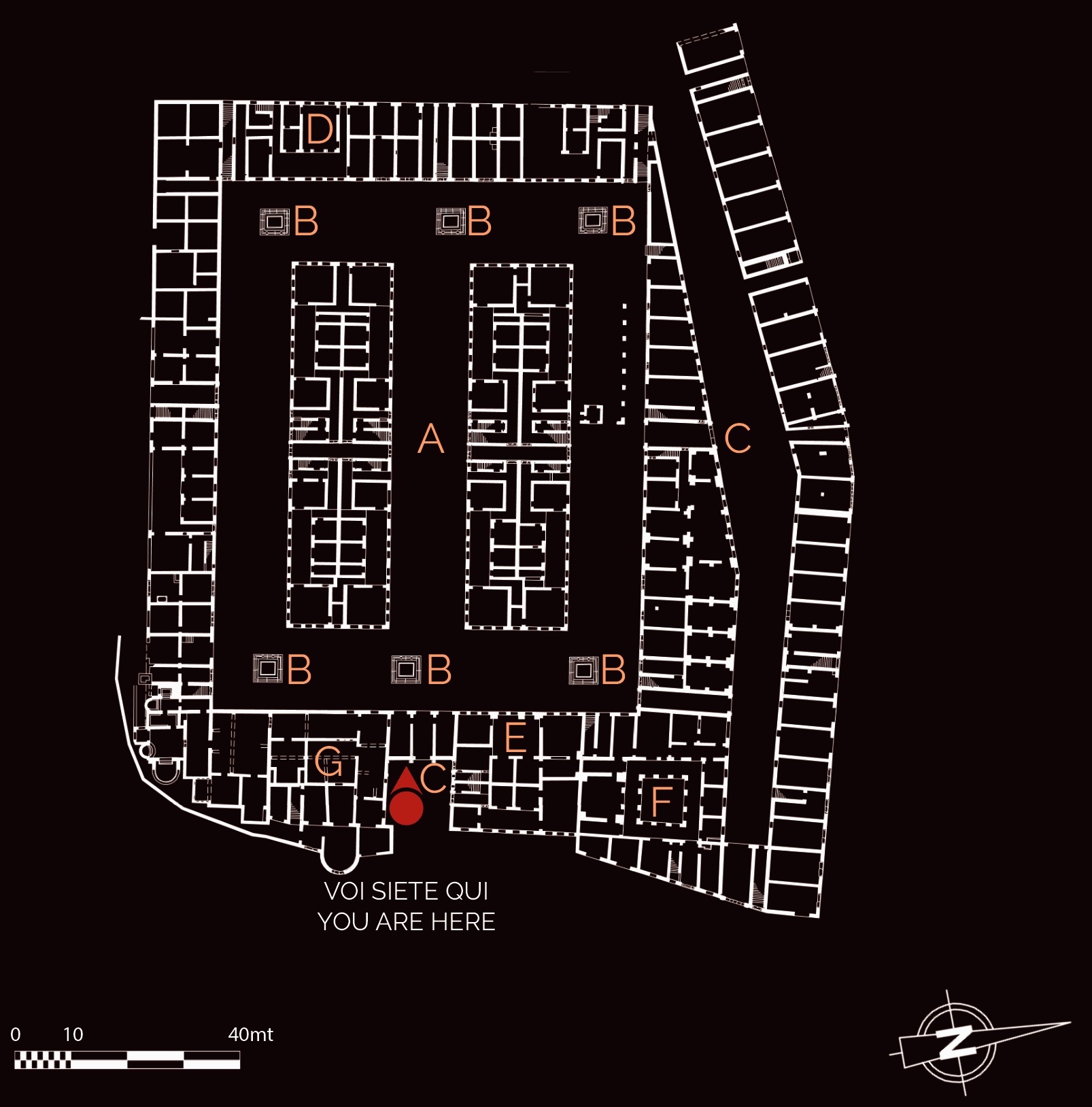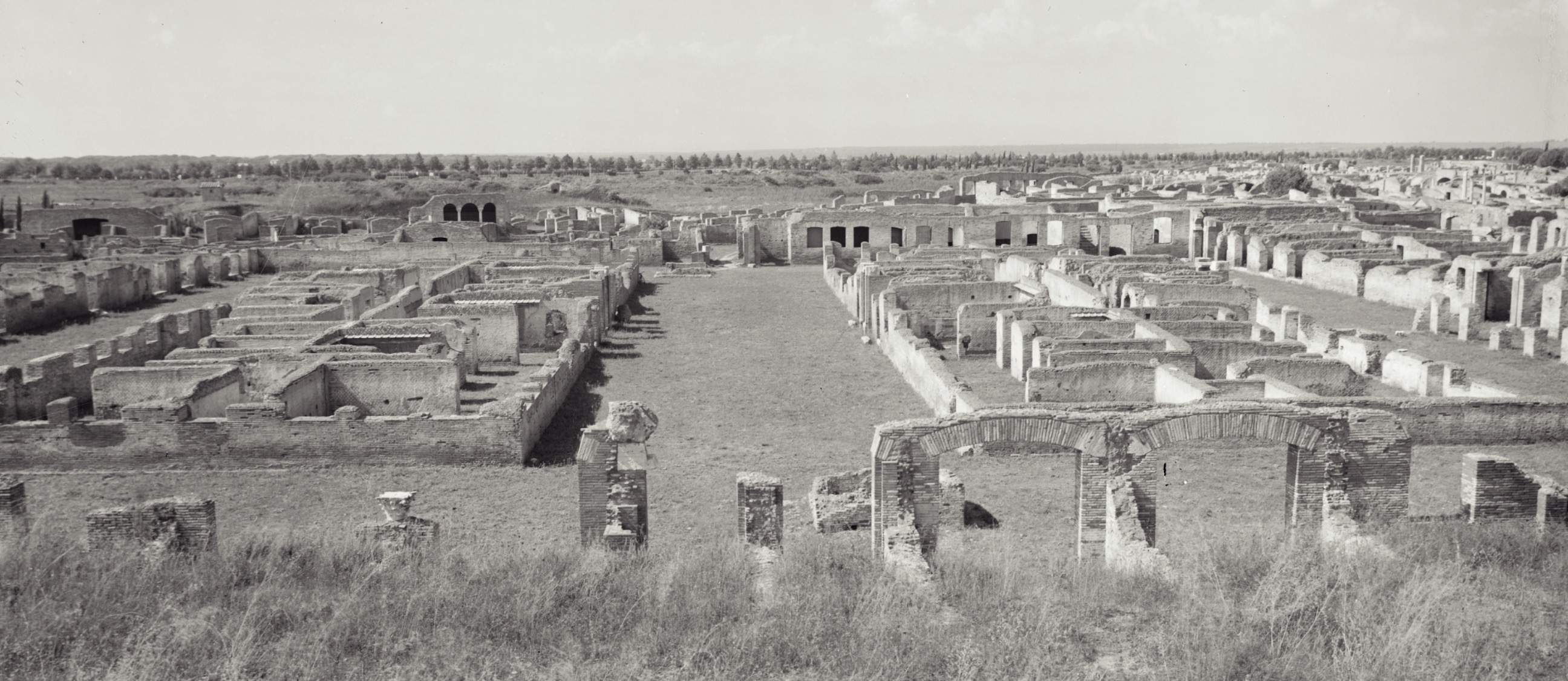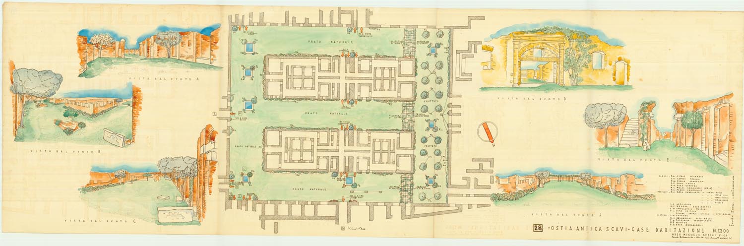 Le Case a Giardino, realizzate intorno al 130 d.C. nell’ambito di un vasto piano edilizio, avevano una funzione prevalentemente residenziale, pur essendo dotate anche di spazi commerciali e di servizio. Il complesso era composto da un quadrilatero esterno e da due blocchi centrali simmetrici, separati da uno spazio adibito a giardino (A), dotato di sei fontane (B). Gli edifici, di almeno tre piani e accessibili dal giardino, avevano scale esterne per raggiungere gli appartamenti posti ai piani più alti, generalmente destinati all’affitto. L’insieme, funzionale ed elegante come un moderno condominio di lusso, era abitato dal ceto medio della città, in un’area prossima al mare e non distante dal centro.