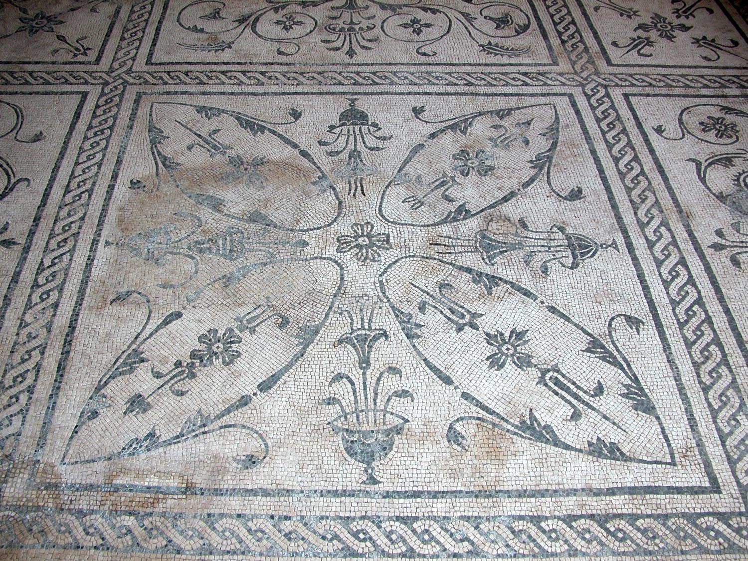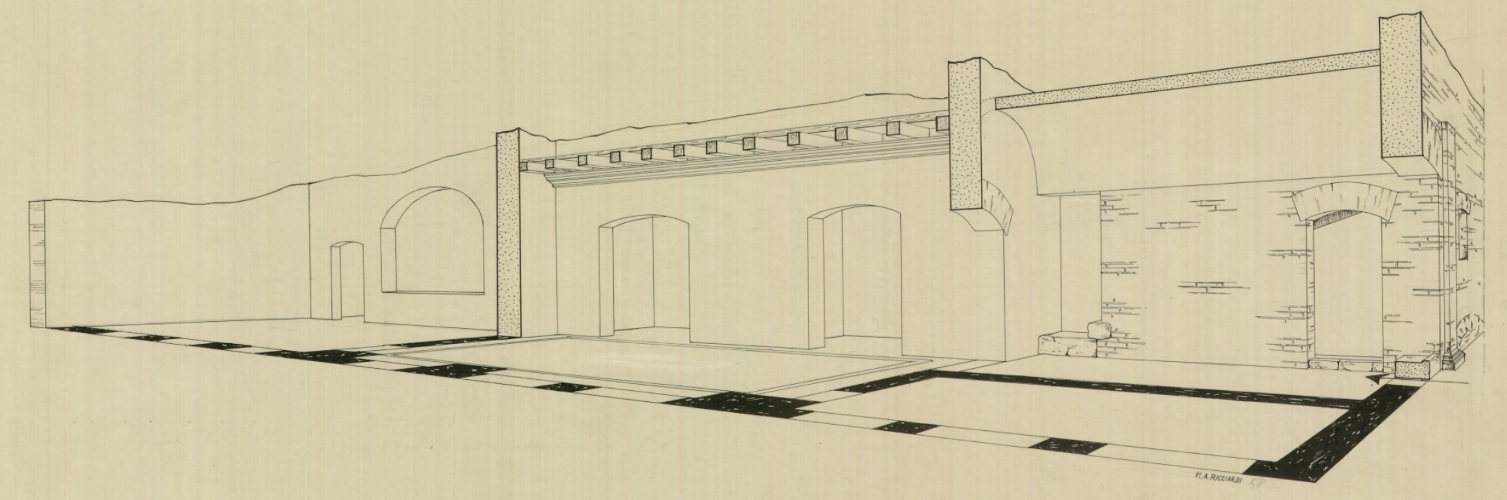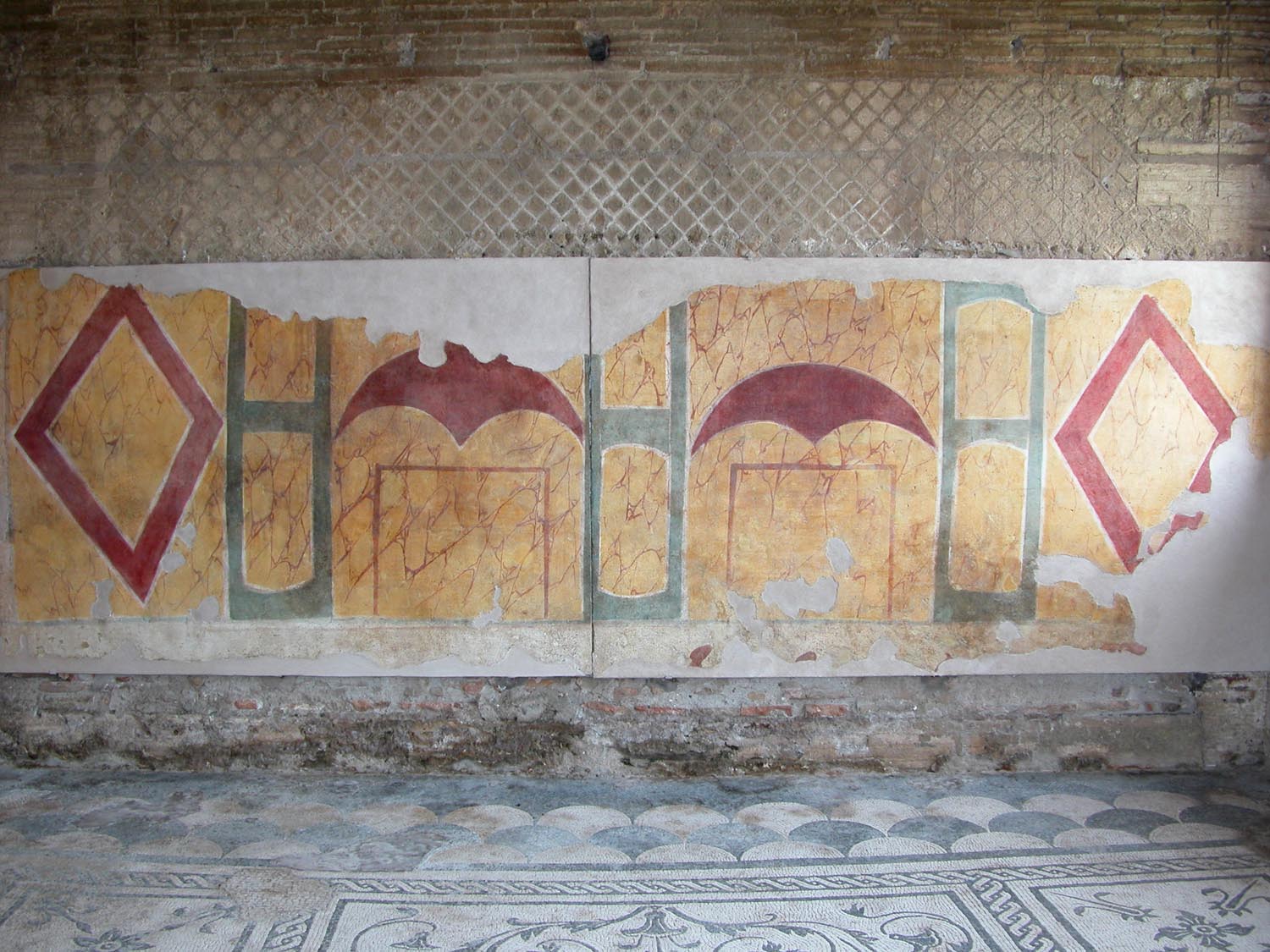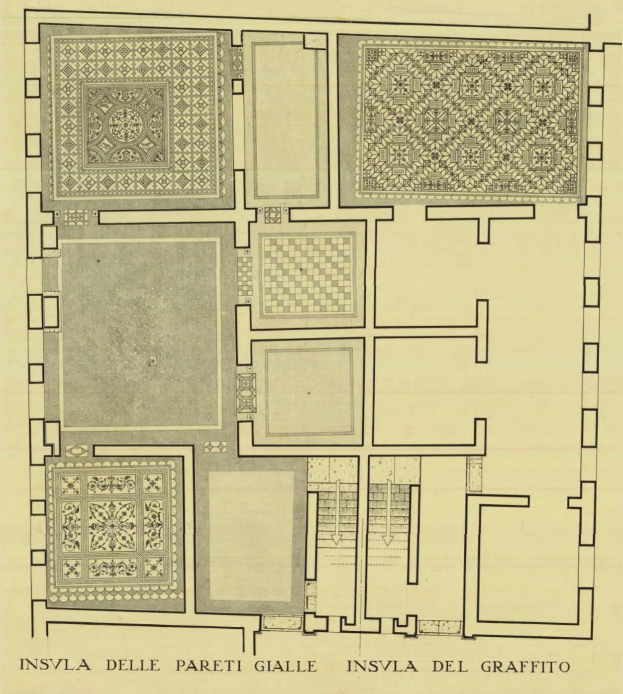 Questa abitazione, che occupa parte del lato orientale delle Case a Giardino, si sviluppava almeno su due piani. Gli ambienti principali (C-D) erano collocati alle due estremità del medianum (B), ampio corridoio centrale con grandi finestre da cui prendeva luce l’intero appartamento. I pavimenti in mosaico, con schemi geometrici e figurati, sono riferibili alla prima fase dell’edificio, di età adrianea (130 d.C.), mentre le decorazioni pittoriche appartengono a rifacimenti successivi, databili fino alla fine del III secolo d.C. La fase pittorica più rappresentativa, risalente alla fine del II secolo d.C., è caratterizzata da uno schema a fondo giallo con leggere architetture e piccoli quadri con paesaggi appena accennati.