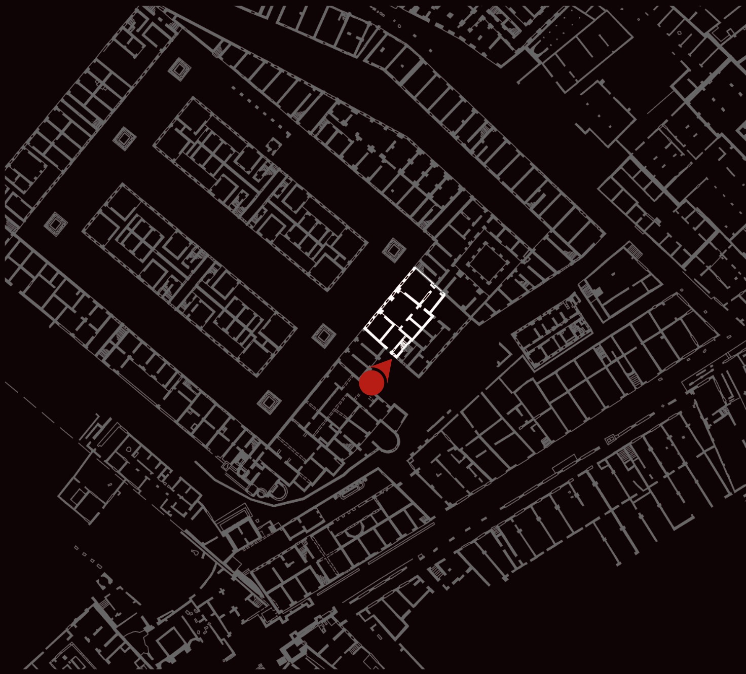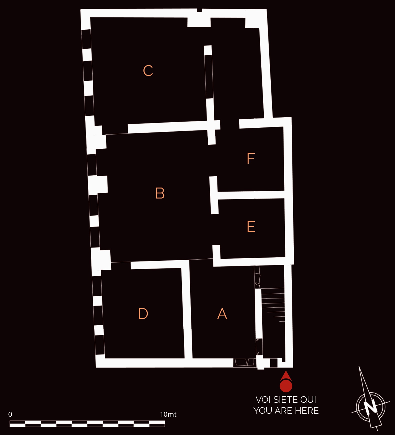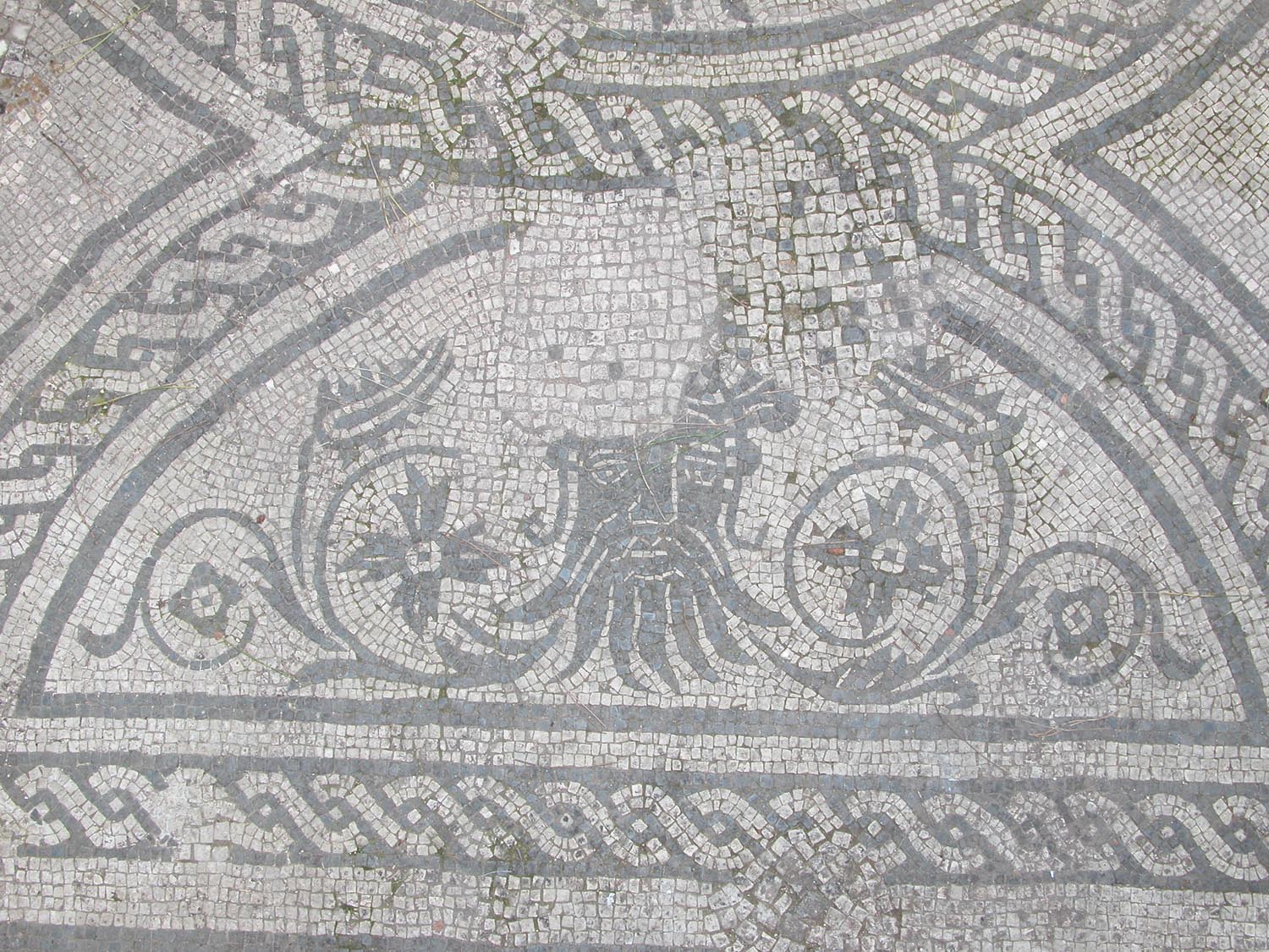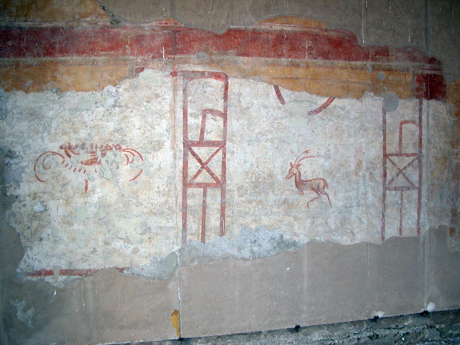 Questa abitazione, che occupa parte del lato orientale delle Case a Giardino, si sviluppava almeno su due piani. Gli ambienti principali (C-D) erano collocati alle due estremità del medianum (B), ampio corridoio centrale con grandi finestre da cui prendeva luce l’intero appartamento. I pavimenti in mosaico, con schemi geometrici e figurati, sono riferibili alla prima fase dell’edificio, di età adrianea (130 d.C.), mentre le decorazioni pittoriche appartengono a rifacimenti successivi, databili fino alla fine del III secolo d.C. La fase pittorica più rappresentativa, risalente alla fine del II secolo d.C., è caratterizzata da uno schema a fondo giallo con leggere architetture e piccoli quadri con paesaggi appena accennati.