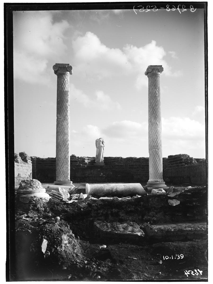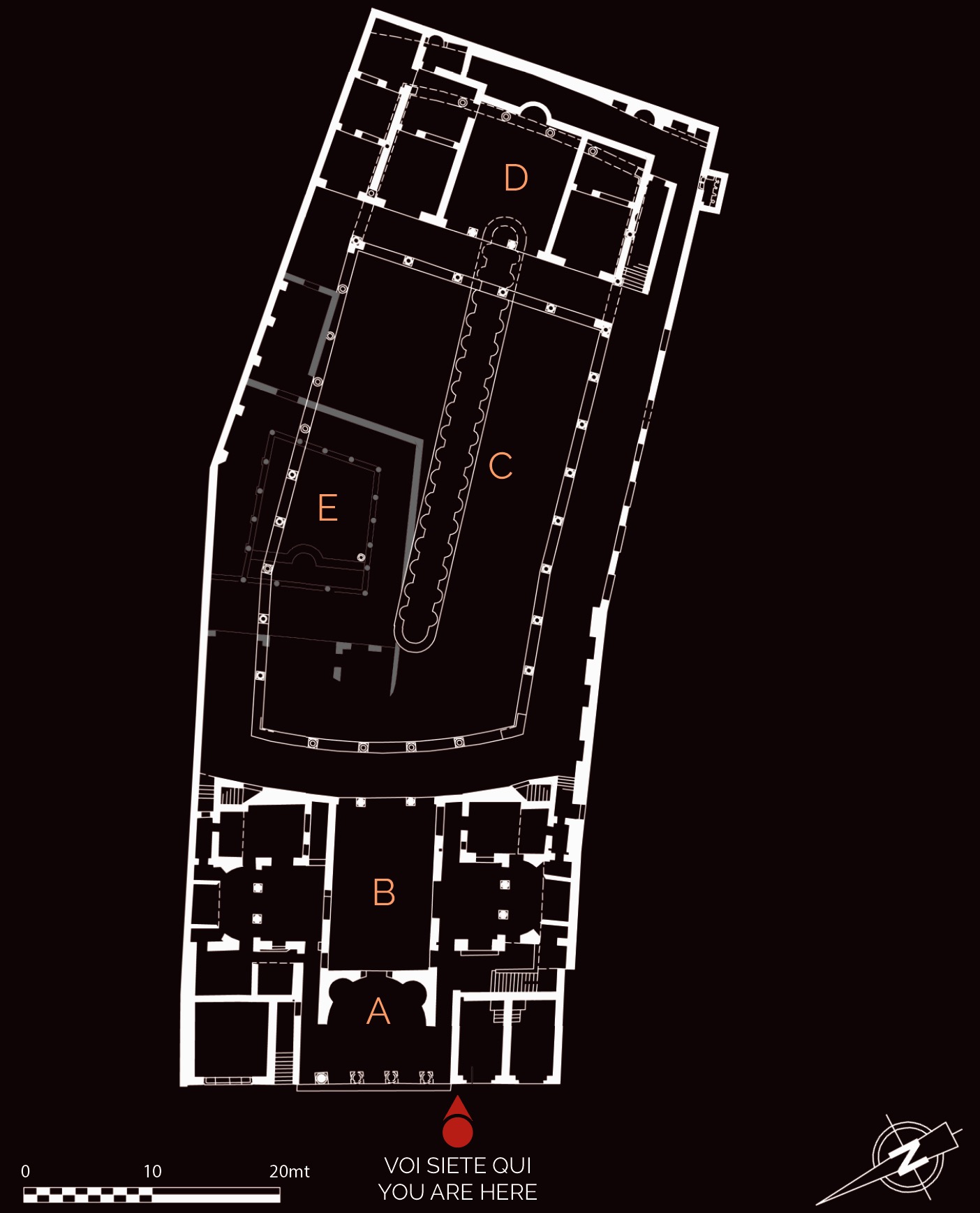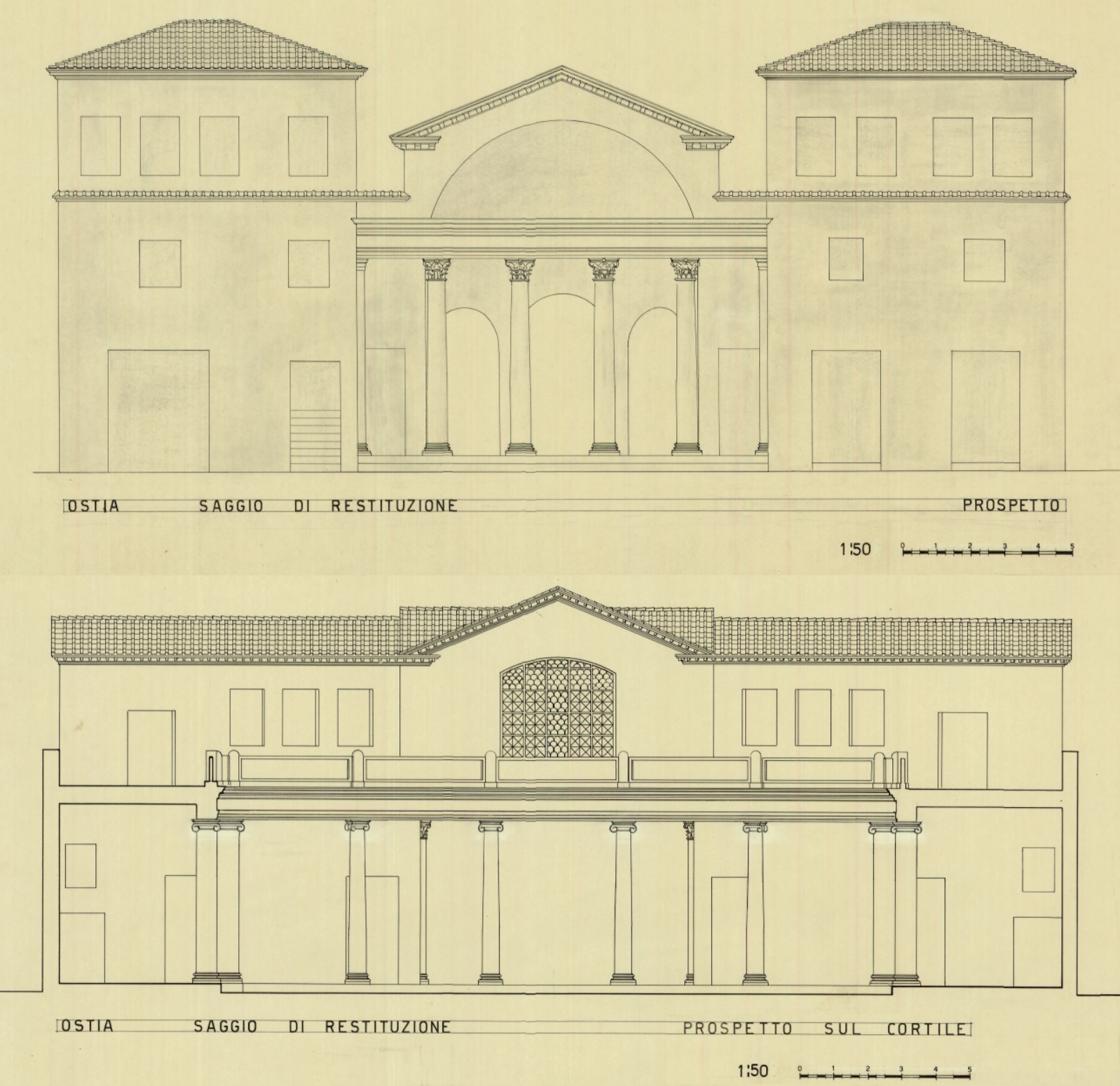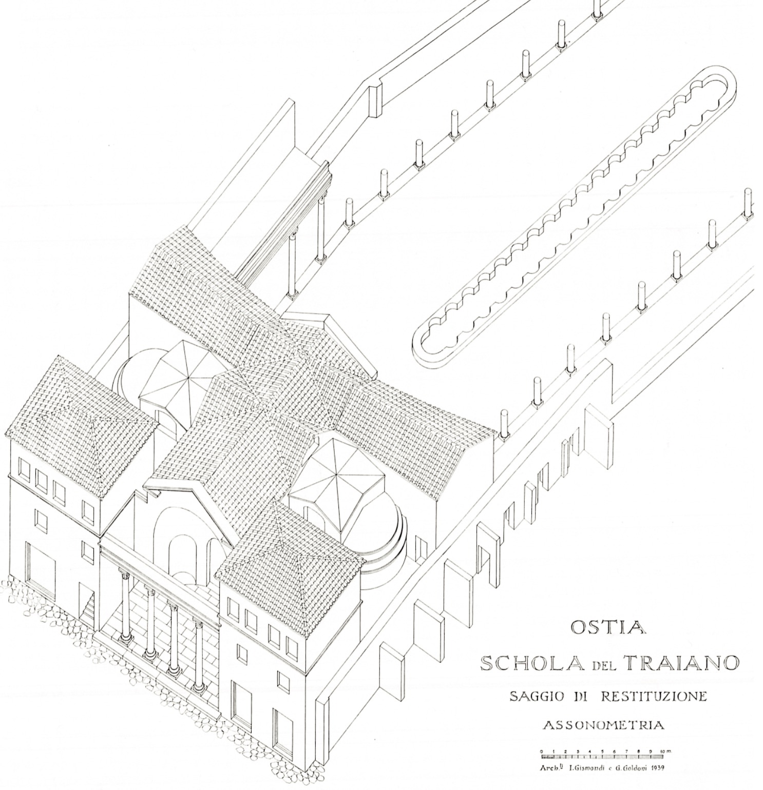 Interpretato come sede del collegio dei fabri navales (costruttori di navi), l’edificio è tradizionalmente datato nel II secolo d.C., ma studi recenti hanno proposto una cronologia al III secolo d.C. Era caratterizzato da un solenne prospetto a esedra con colonne (A), da un vestibolo con ambienti laterali dotati di nicchie (B), in uno dei quali era collocata la statua dell’imperatore Traiano. All’interno, l’edificio si articolava intorno a un grande cortile con colonnato laterizio e vasca centrale (C). Il cortile e la parte di fondo dell’edificio furono trasformati con l’inserimento di una sala da banchetto (D) e di altre stanze di rappresentanza, decorate con pavimenti a intarsi marmorei e affreschi parietali ad imitazione di rivestimenti in marmo. L’edificio sorse su precedenti abitazioni, la più antica delle quali (detta Domus dei Bucrani) è databile al I secolo a.C. A una domus della prima età imperiale (E) appartengono invece un peristilio e ambienti con mosaici, oggi parzialmente ricostruiti nel cortile della Schola.
