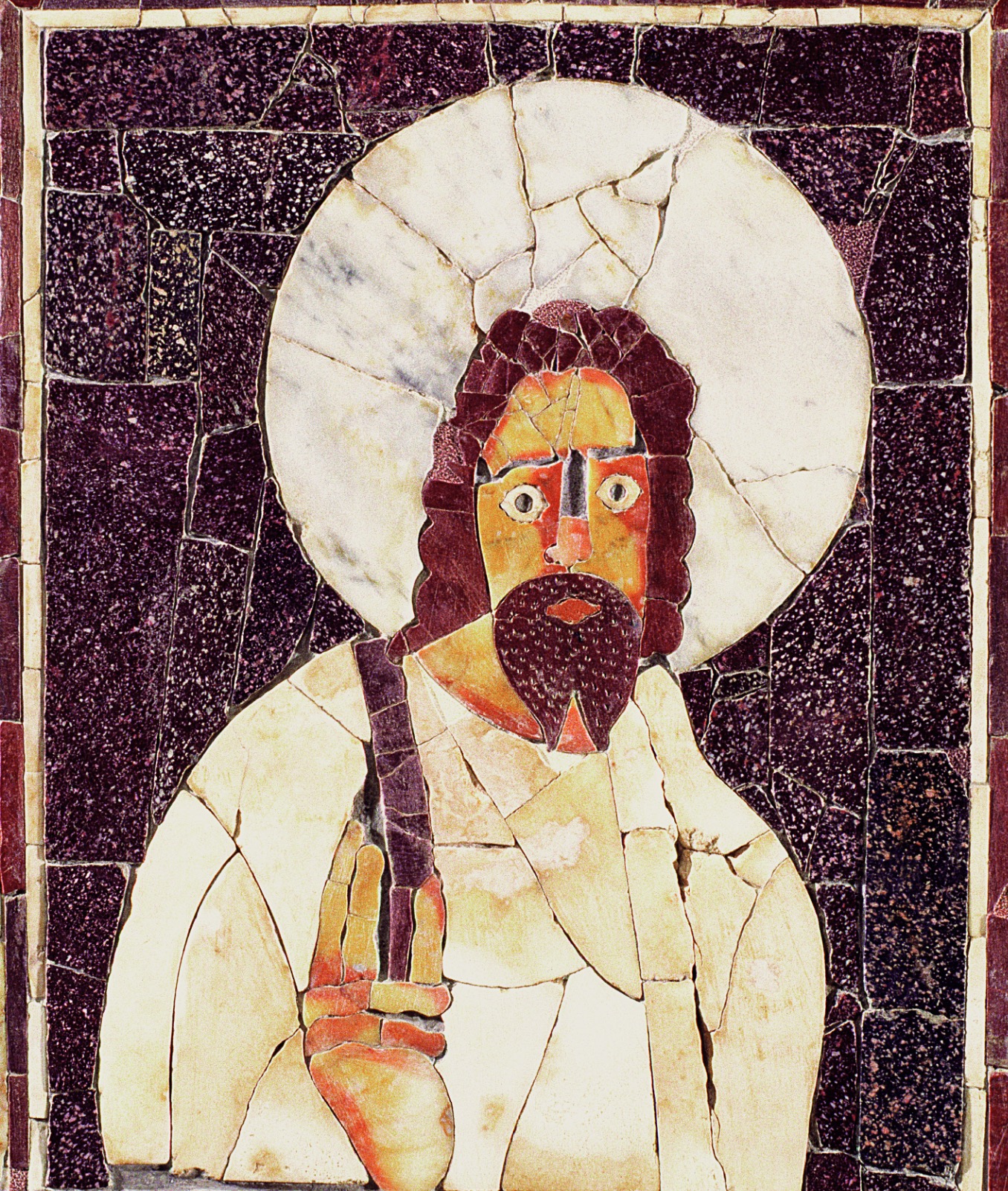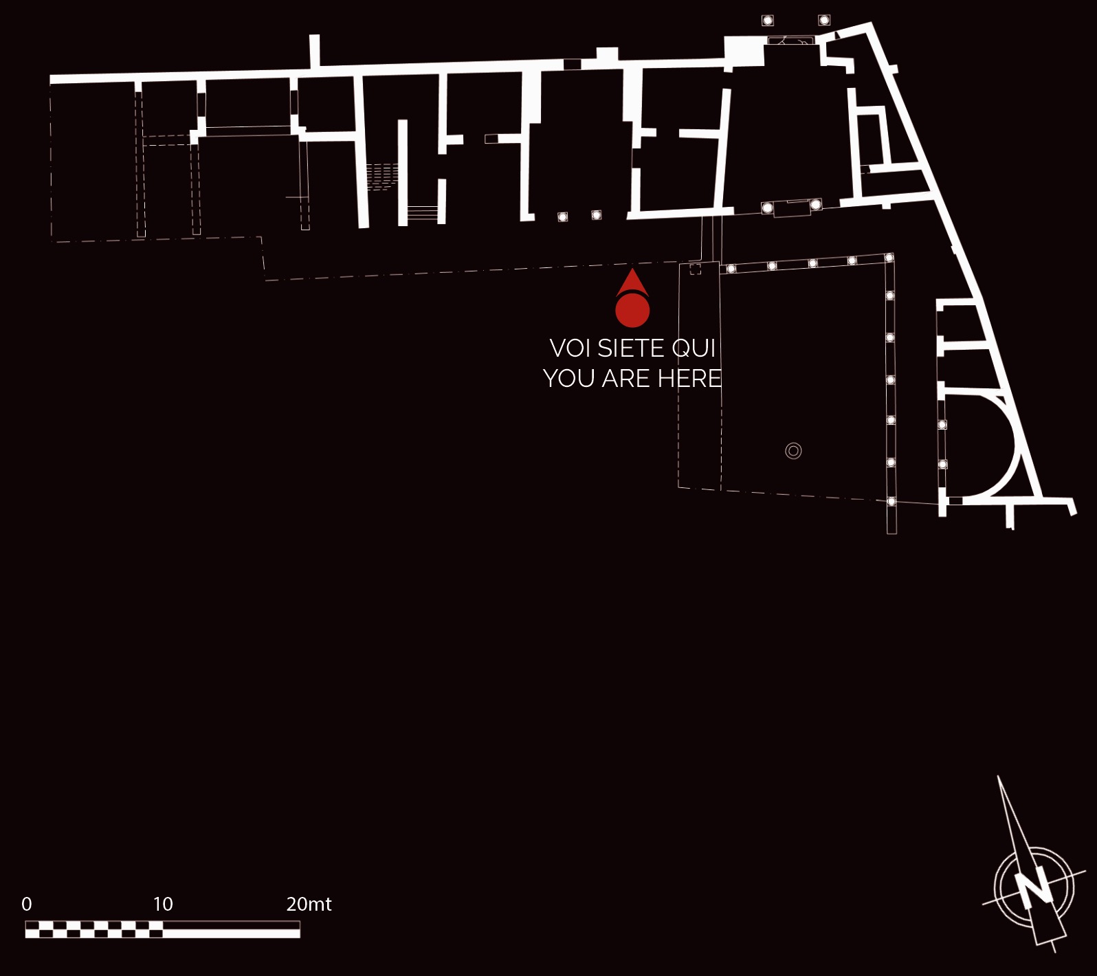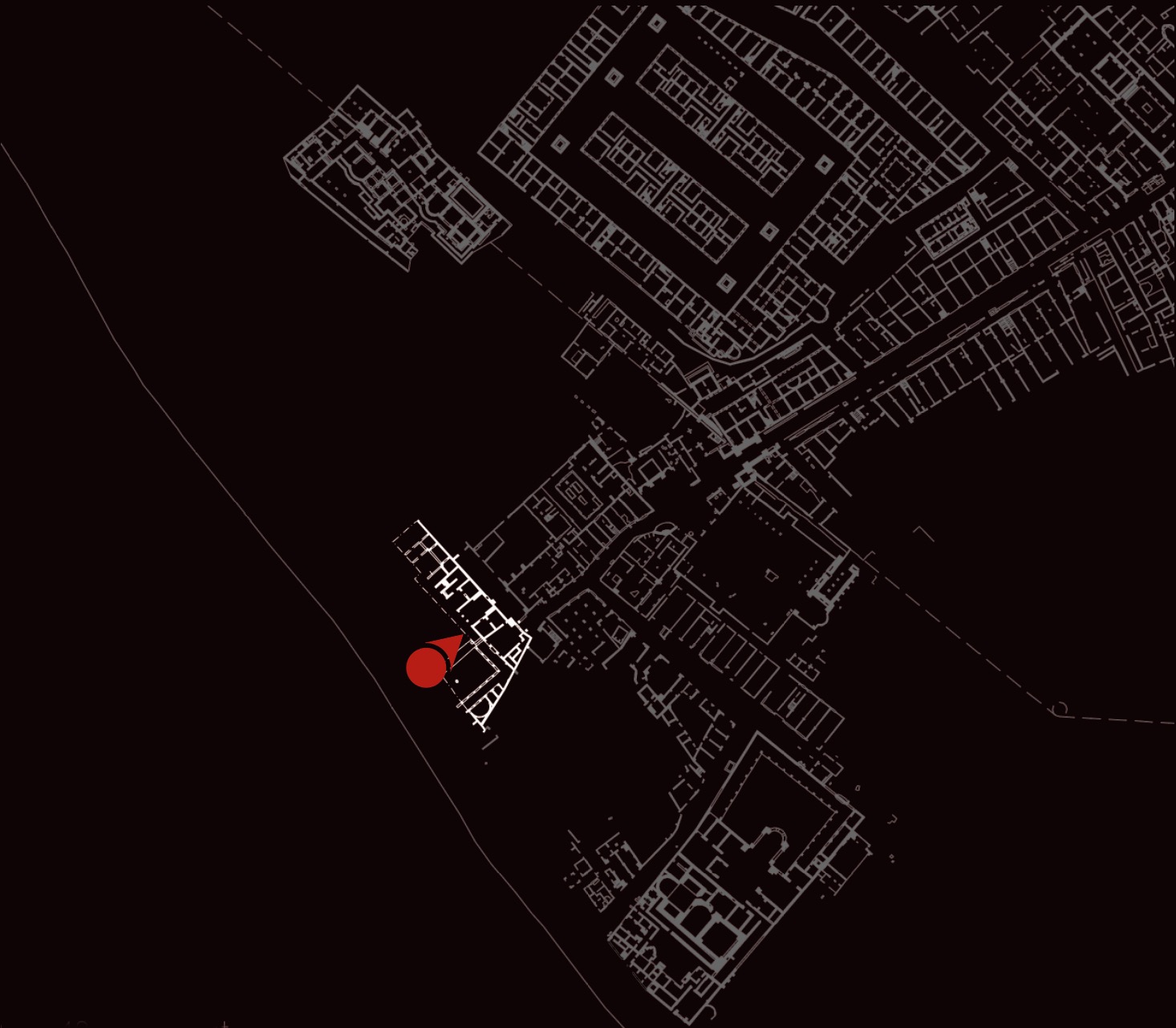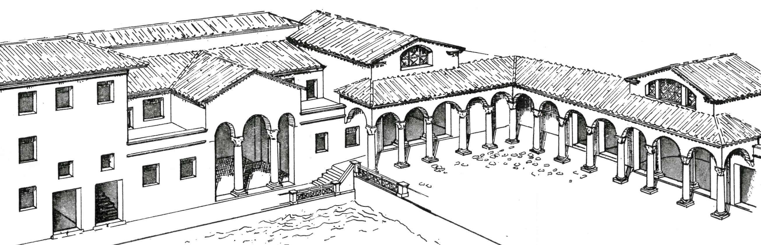 Il complesso, variamente interpretato come domus signorile o sede collegiale, costituisce la trasformazione tarda (IV secolo d.C.) di un precedente edificio di II secolo d.C. Fu costruito al termine del Decumano, di cui occupò la sede stradale, impostandosi su una diga eretta nella prima epoca imperiale a protezione del litorale. L’impianto, messo in luce solo in parte, era caratterizzato da una vasta corte con almeno due lati colonnati, fiancheggiata da diversi ambienti. La sala principale ha restituito in stato di crollo una eccezionale decorazione parietale a intarsi marmorei (opus sectile), con motivi geometrici, vegetali e figurati: la presenza del ritratto di un uomo barbato con mano destra sollevata e nimbo (aureola) ha fatto ipotizzare che potesse trattarsi di un edificio cristiano o della sede di una setta filosofica pagana.
